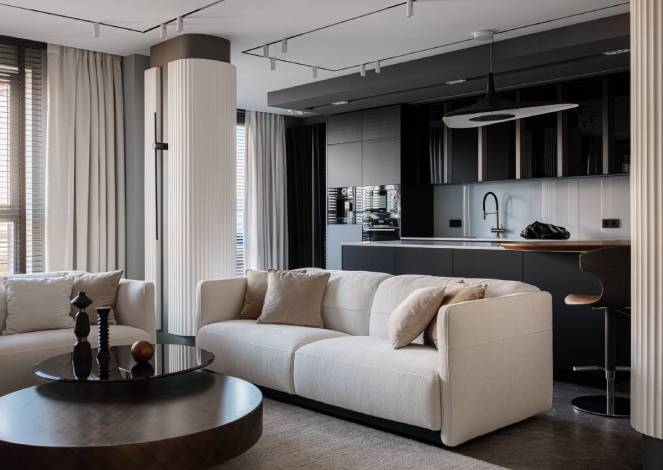 В этом современном интерьере, созданном архитектурным бюро Decora, строгая респектабельность встречается с домашним уютом, а функциональность пространства идет рука об руку с элегантной французской эстетикой.