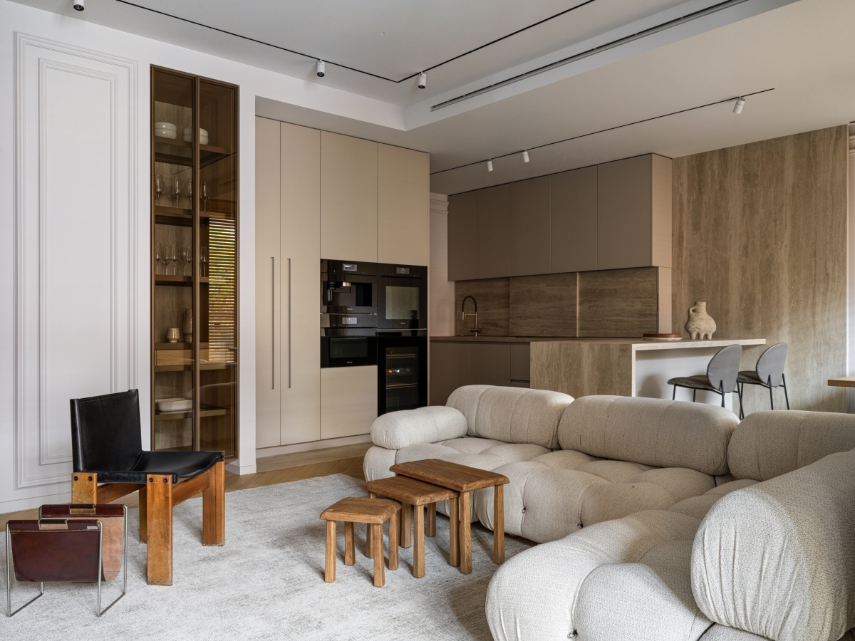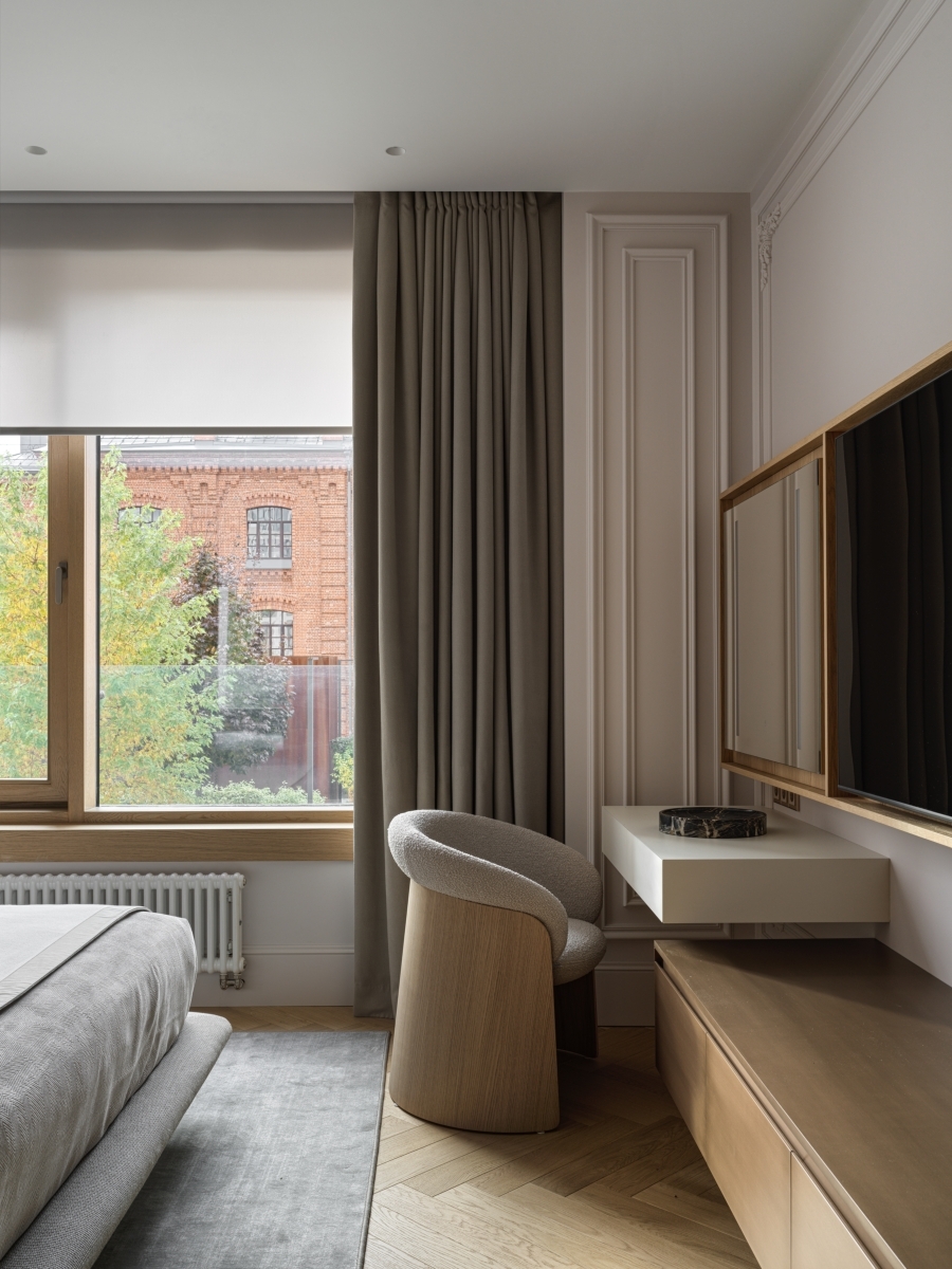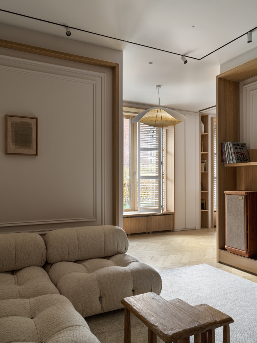 В самом центре Москвы, где исторический облик города встречается с современным дизайном, находится двухуровневая квартира-резиденция. Ее уникальное расположение на первом этаже с прямым выходом во внутренний двор задало тон всей концепции проекта: уединенный оазис, тщательно оберегаемый от посторонних взглядов, но при этом наполненный светом и воздухом. Этот баланс был достигнут благодаря изящным ставням на выходящих в оживленный двор панорамных окнах. Они не только обеспечили приватность, мягко отделив частную жизнь от внешнего мира, но и наполнили интерьер игрой рассеянного света.