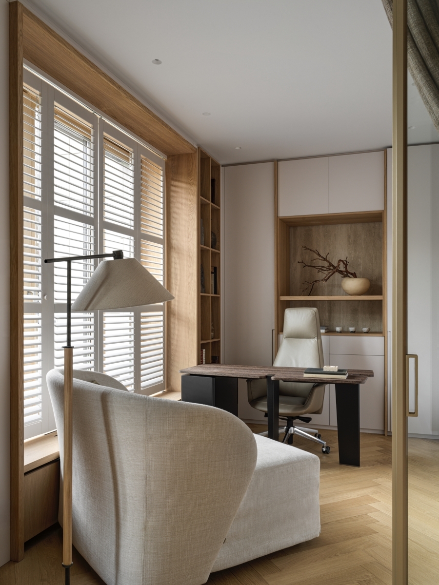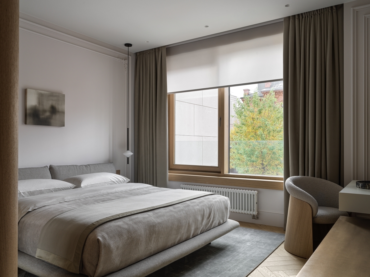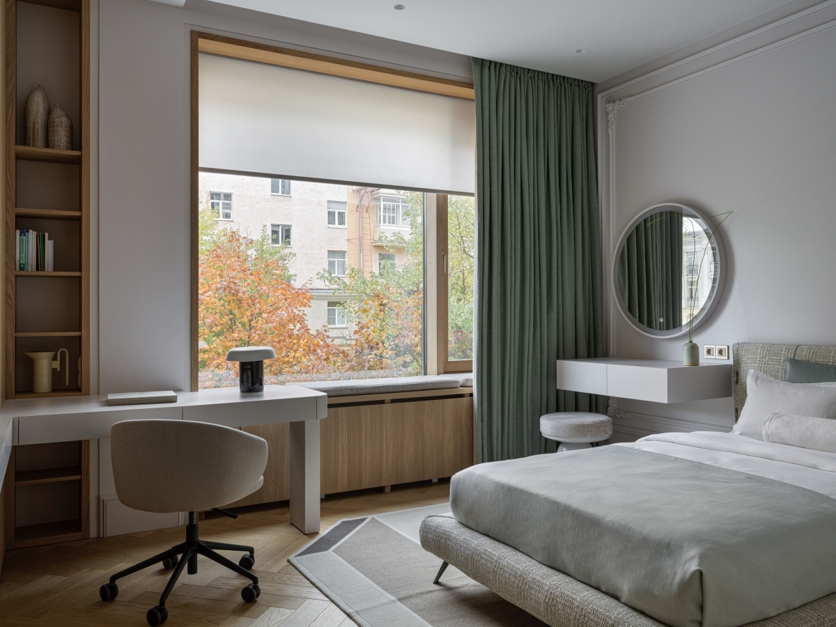 В самом центре Москвы, где исторический облик города встречается с современным дизайном, находится двухуровневая квартира-резиденция. Ее уникальное расположение на первом этаже с прямым выходом во внутренний двор задало тон всей концепции проекта: уединенный оазис, тщательно оберегаемый от посторонних взглядов, но при этом наполненный светом и воздухом. Этот баланс был достигнут благодаря изящным ставням на выходящих в оживленный двор панорамных окнах. Они не только обеспечили приватность, мягко отделив частную жизнь от внешнего мира, но и наполнили интерьер игрой рассеянного света.