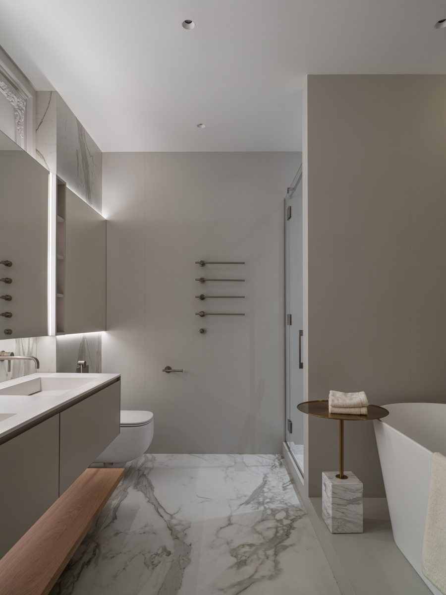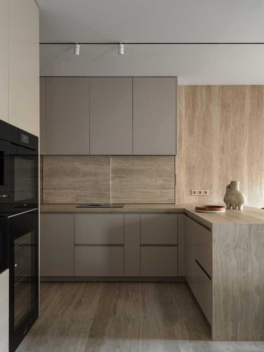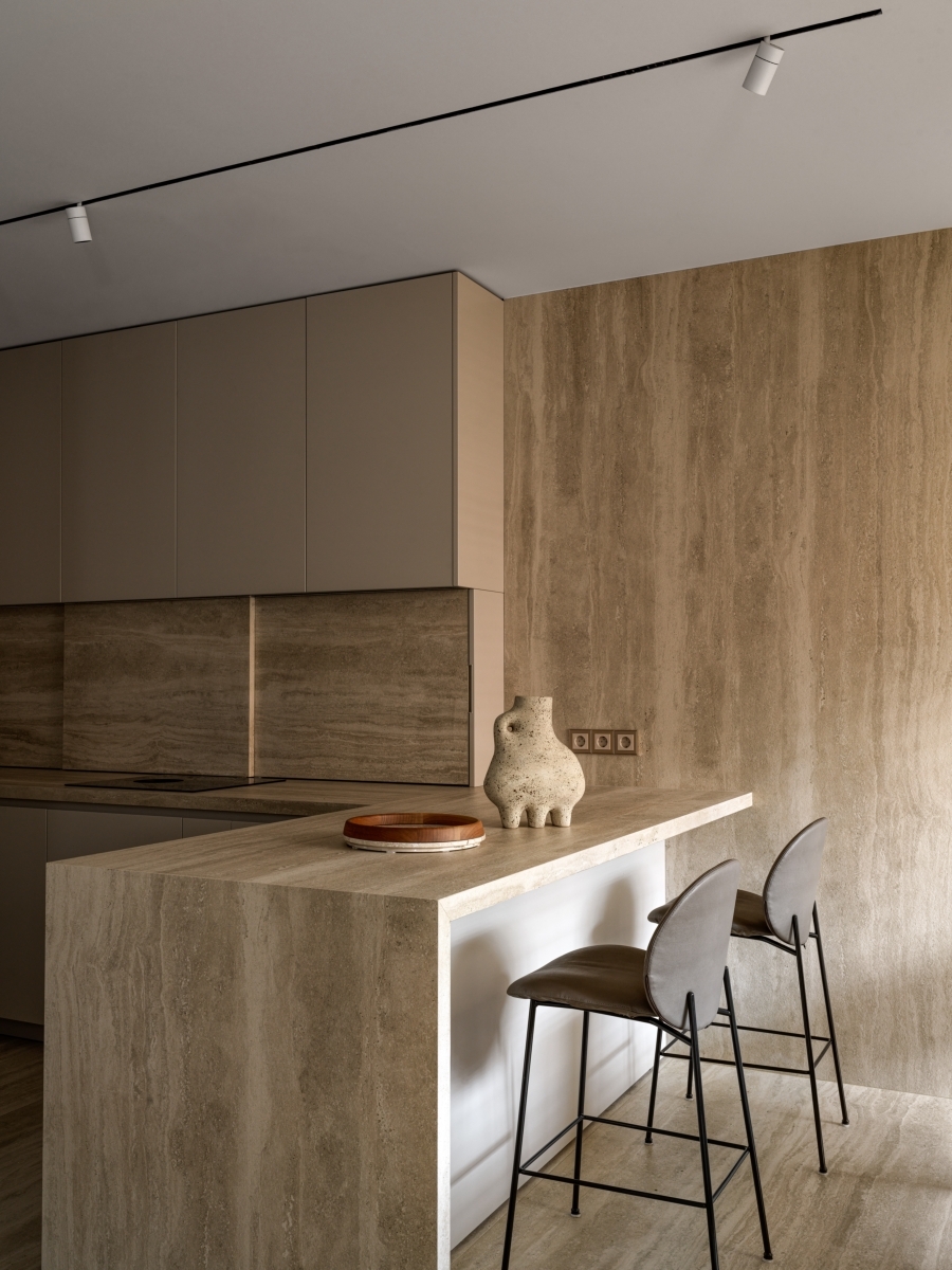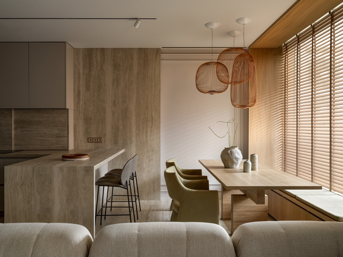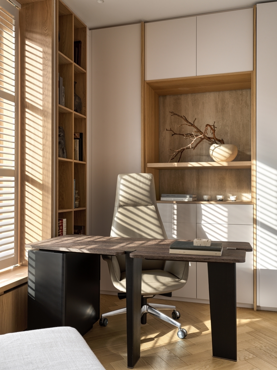 Контраст строится не на цвете, а на нюансах фактур и температуре материалов. Теплый выбеленный дуб и натуральный травертин создают текстурный дуэт, формируя ауру спокойной роскоши. Архитекторы во главе с автором проекта позволили интерьеру формироваться в диалоге с заказчиком. Здесь, при четком запросе, они создали уникальный интерьер — пространство вневременной ценности, где рациональность планировки и поэзия восприятия существуют в идеальном балансе.