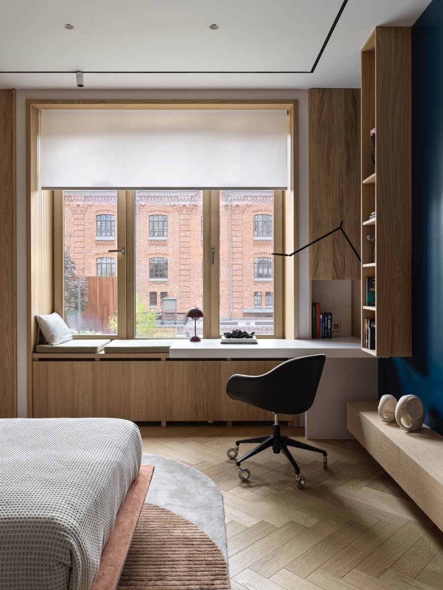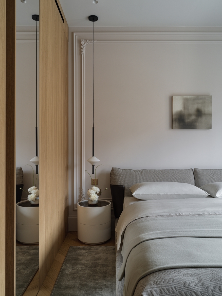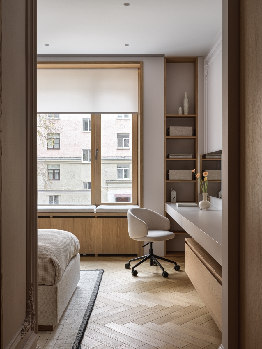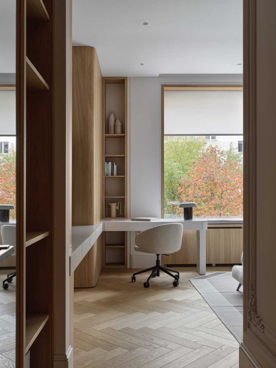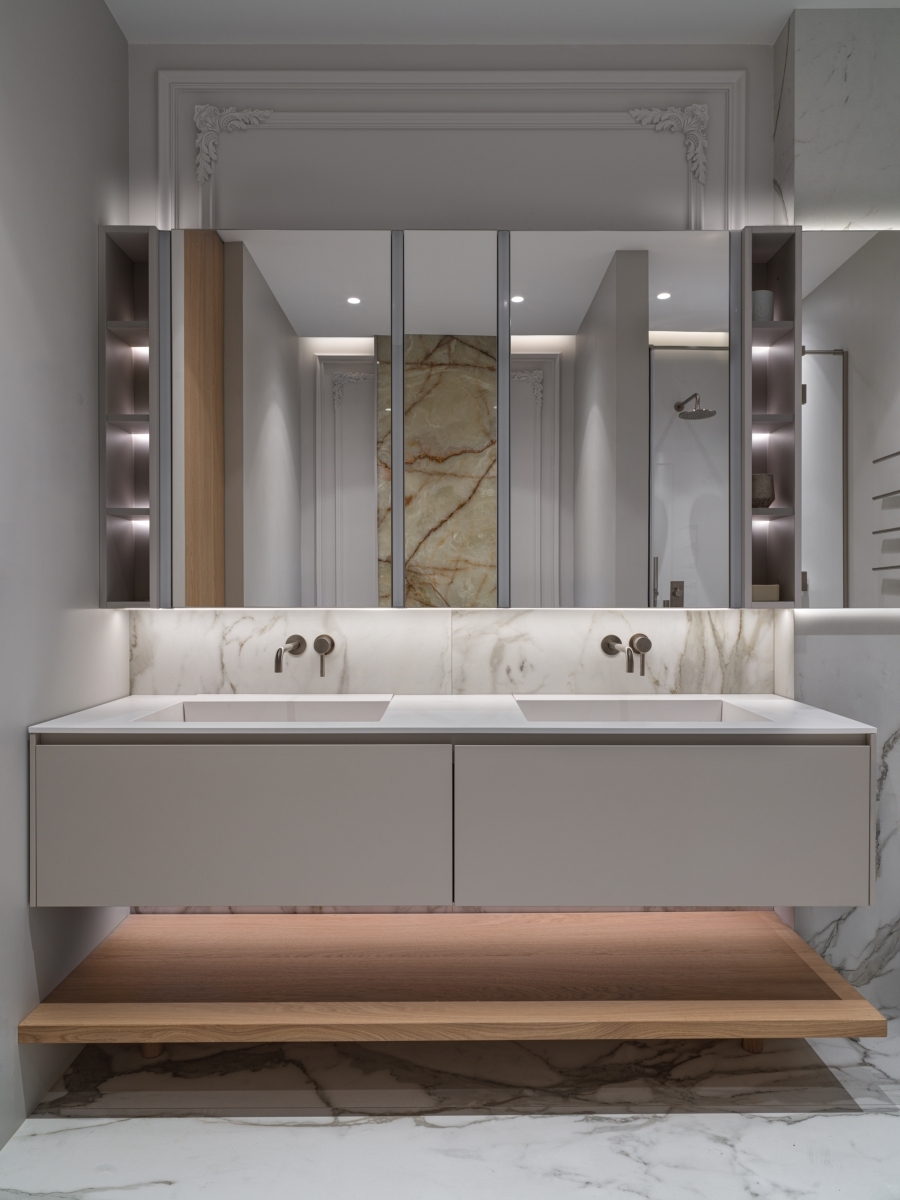 Контраст строится не на цвете, а на нюансах фактур и температуре материалов. Теплый выбеленный дуб и натуральный травертин создают текстурный дуэт, формируя ауру спокойной роскоши. Архитекторы во главе с автором проекта позволили интерьеру формироваться в диалоге с заказчиком. Здесь, при четком запросе, они создали уникальный интерьер — пространство вневременной ценности, где рациональность планировки и поэзия восприятия существуют в идеальном балансе.