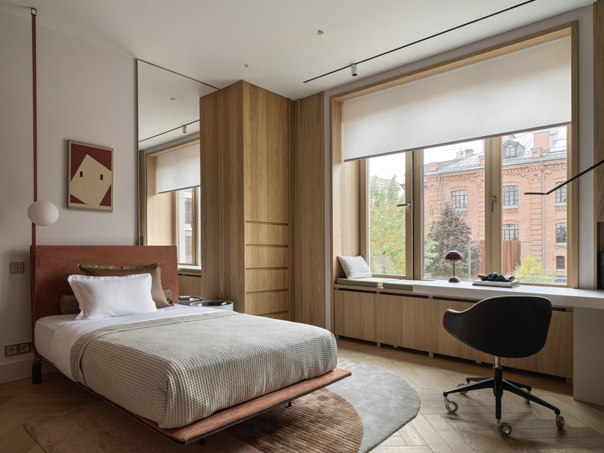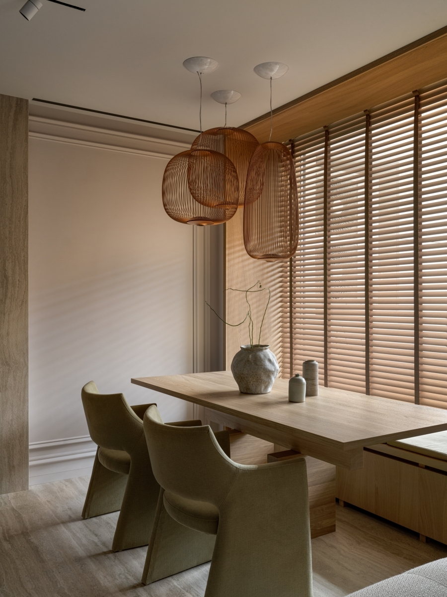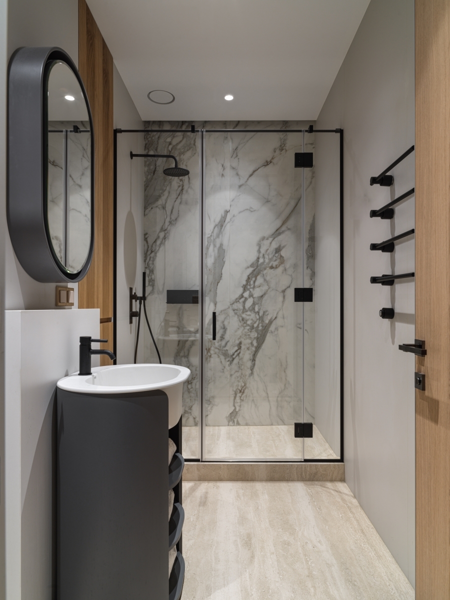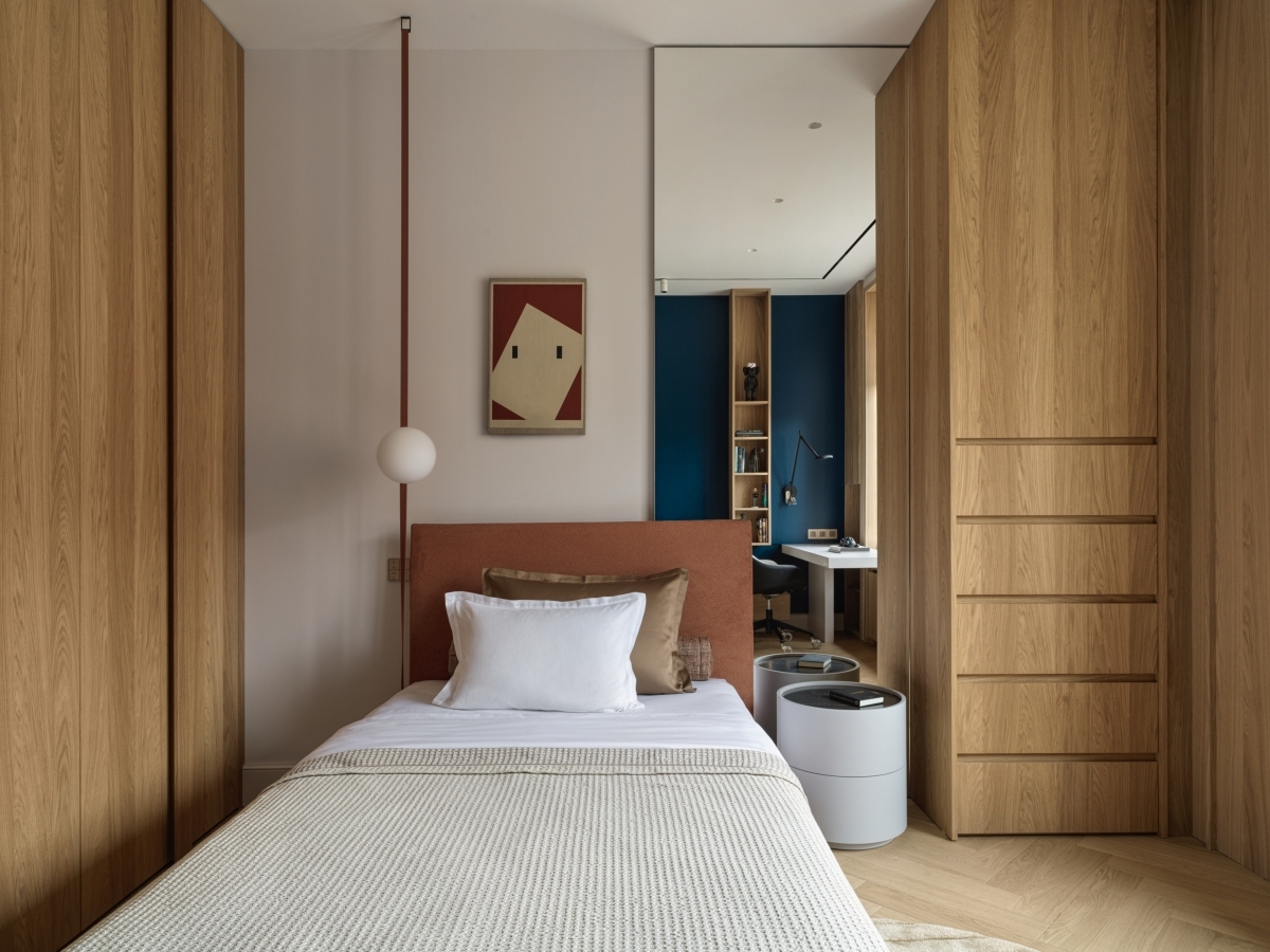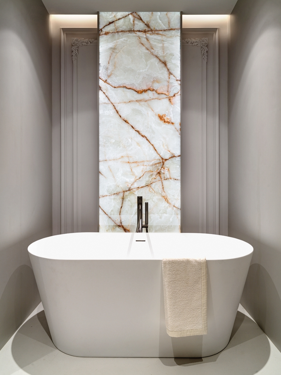 Контраст строится не на цвете, а на нюансах фактур и температуре материалов. Теплый выбеленный дуб и натуральный травертин создают текстурный дуэт, формируя ауру спокойной роскоши. Архитекторы во главе с автором проекта позволили интерьеру формироваться в диалоге с заказчиком. Здесь, при четком запросе, они создали уникальный интерьер — пространство вневременной ценности, где рациональность планировки и поэзия восприятия существуют в идеальном балансе.