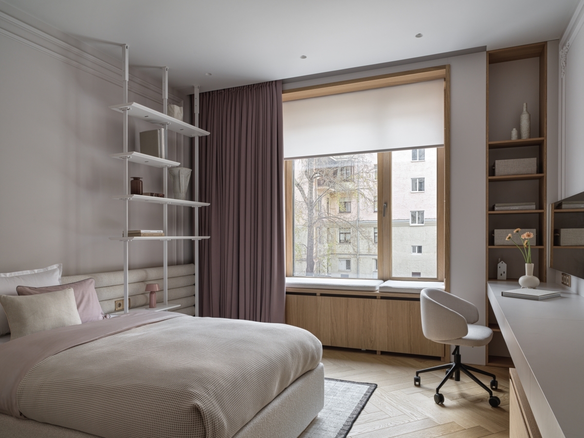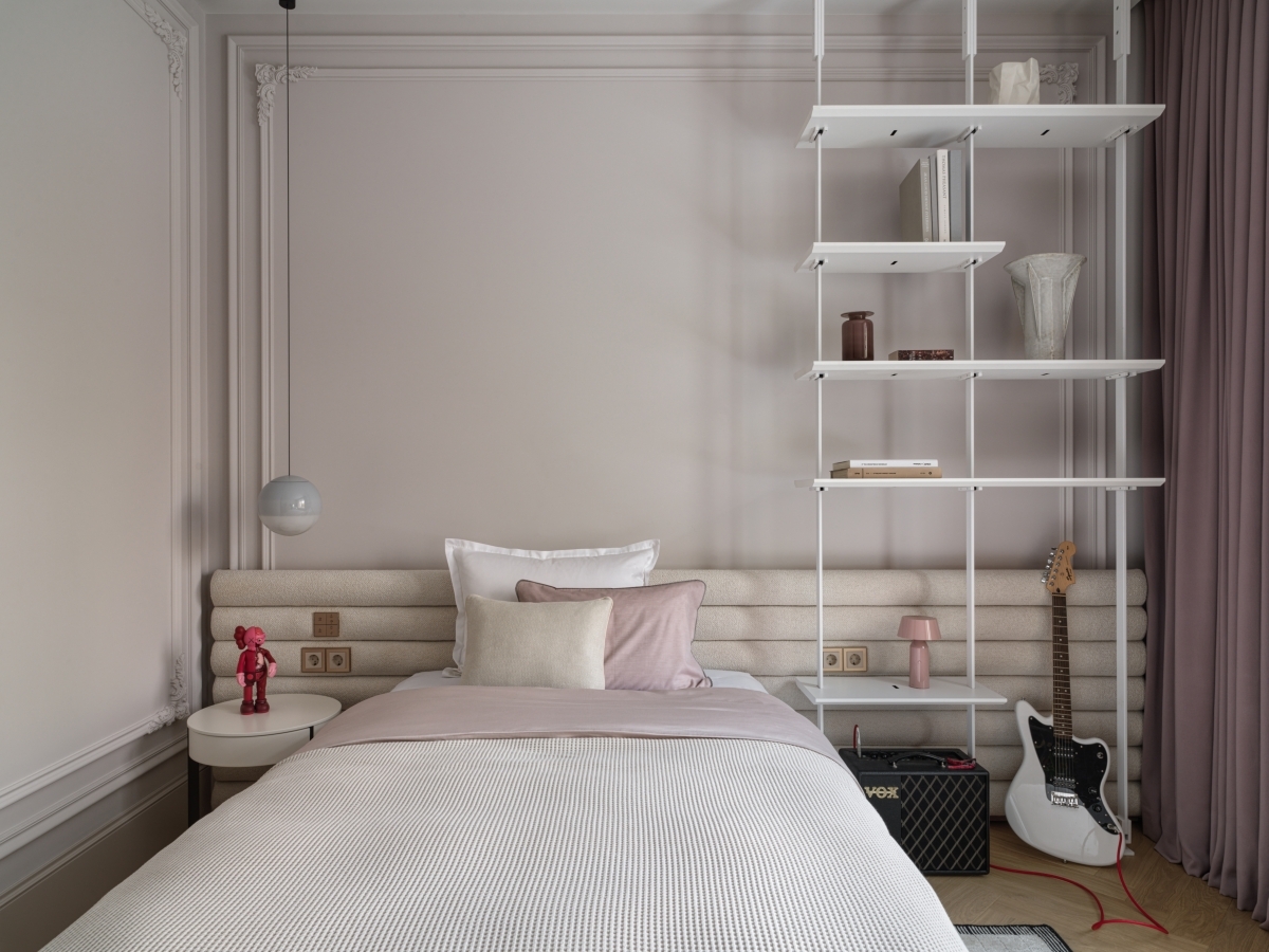 Спальня девочки. Кровать с мягким изголовьем, «Титан-Мебель». Стеллаж, Cattelan Italia. Прикроватная тумбочка, Lema (Лема). Подвесной светильник, Marset (Марсет). Спальня девочки. Кровать с мягким изголовьем, «Титан-Мебель». Стеллаж, Cattelan Italia. Прикроватная тумбочка, Lema (Лема). Подвесной светильник, Marset (Марсет).
