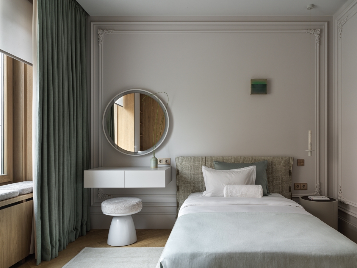 Спальня второй девочки. Кровать, Bonaldo (Бональдо). Консоль, зеркало, «Титан-Мебель». Пуф, Ana Roque Interiors (Ана Роке). Спальня второй девочки. Кровать, Bonaldo (Бональдо). Консоль, зеркало, «Титан-Мебель». Пуф, Ana Roque Interiors (Ана Роке).