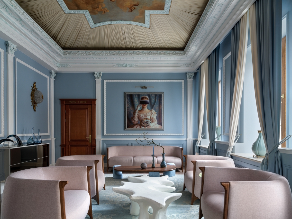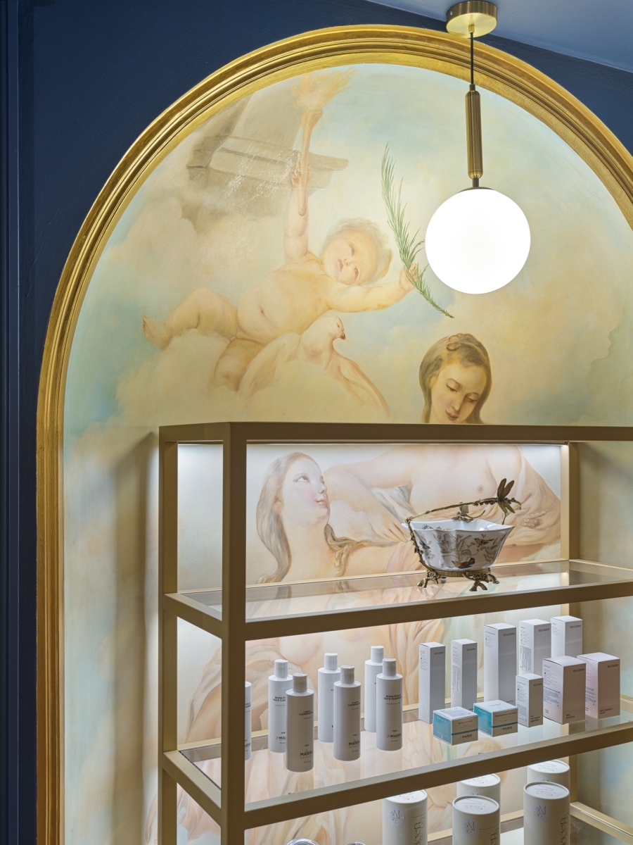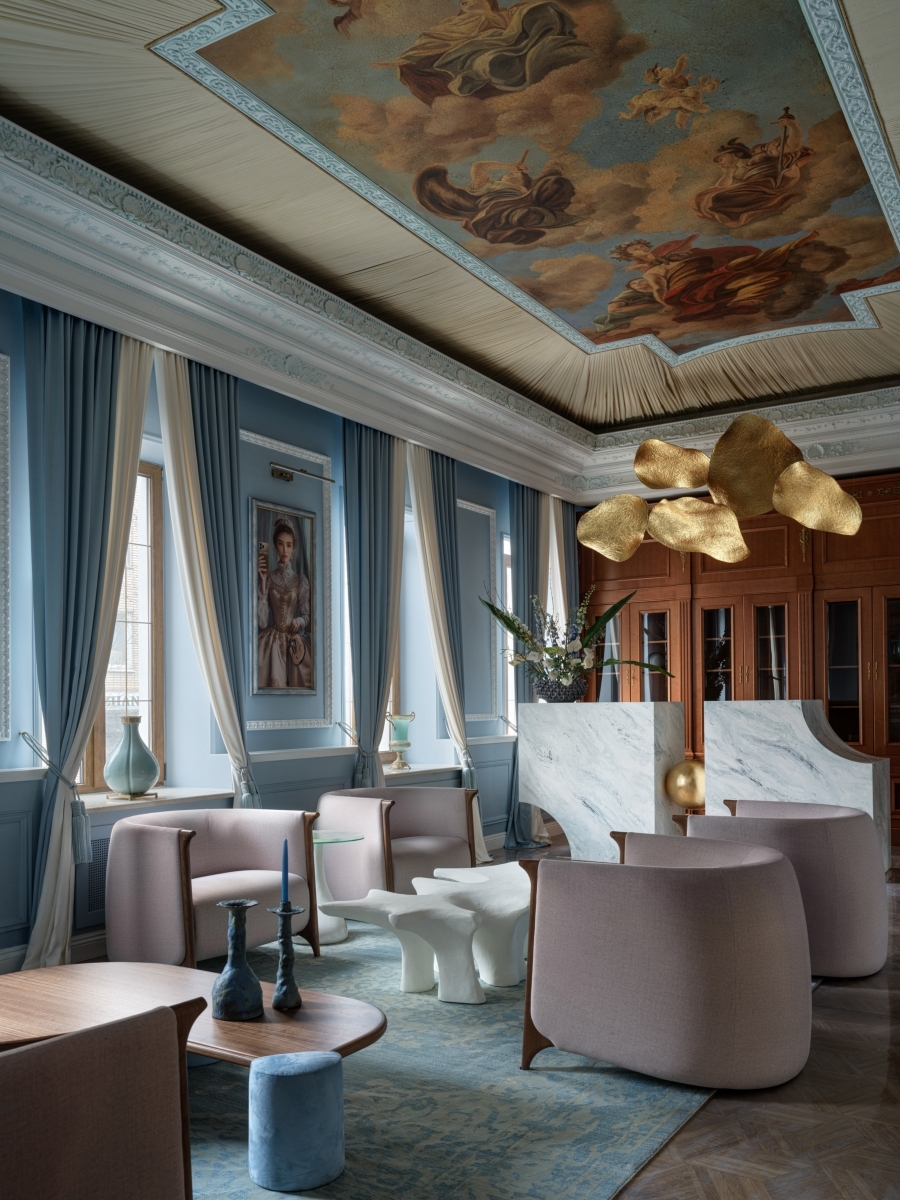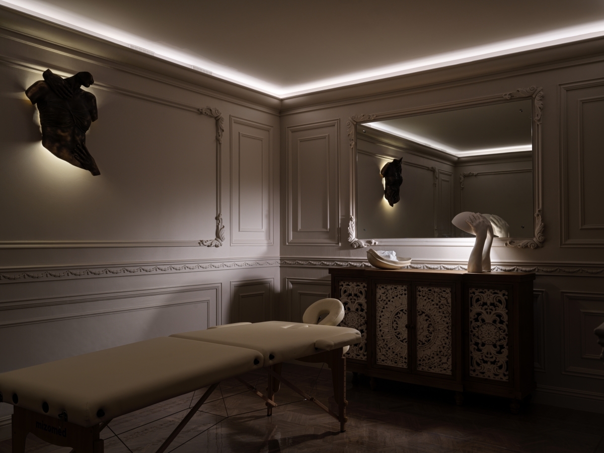 По признанию авторов проекта Татьяны Григорьевой и Сандры Балоян, они отказались от стерильной эстетики бежевых клиник в пользу изысканной эклектики, навеянной духом Марии-Антуанетты. И пространство наполнилось диалогом эпох: монументальная лепнина, тяжелые карнизы и фрески дополнены современными предметами мебели и декором.