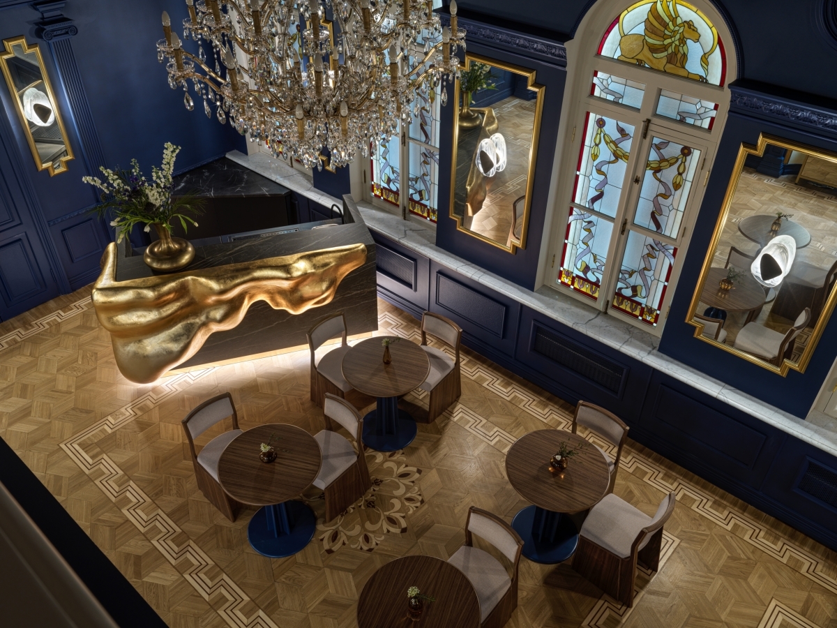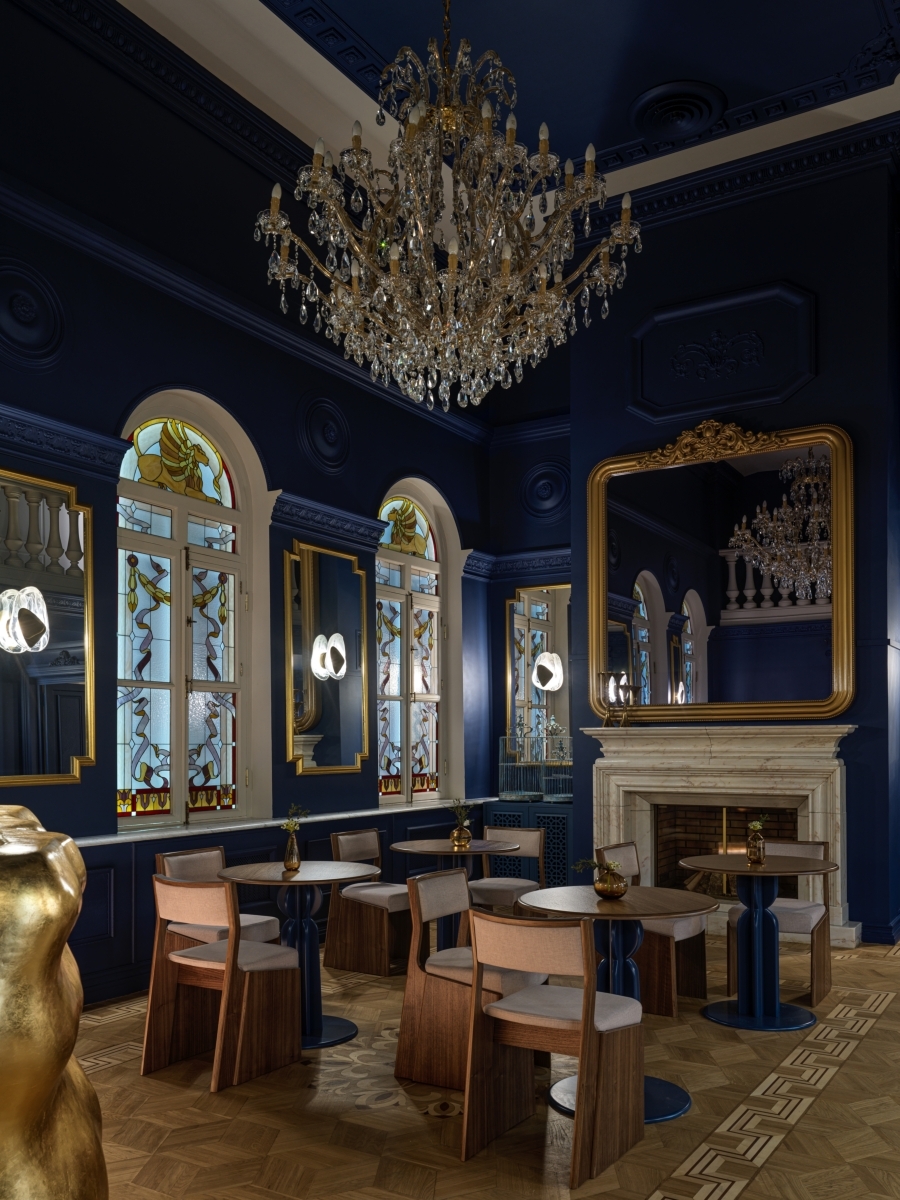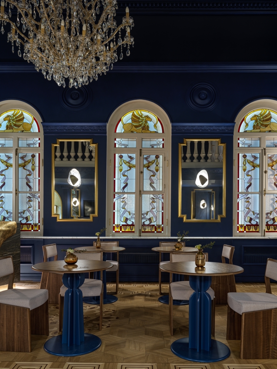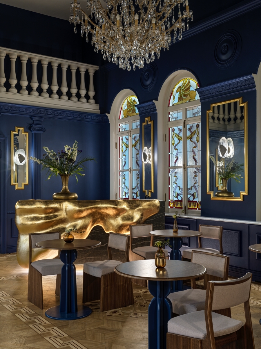 Синий зал выполнен в благородном синем оттенке из палитры красок Majestic. Здесь отреставрированы исторические паркеты и лепнина, а центром притяжения служит уникальный бар, напоминающий застывшую золотую лаву. Синий зал выполнен в благородном синем оттенке из палитры красок Majestic. Здесь отреставрированы исторические паркеты и лепнина, а центром притяжения служит уникальный бар, напоминающий застывшую золотую лаву.