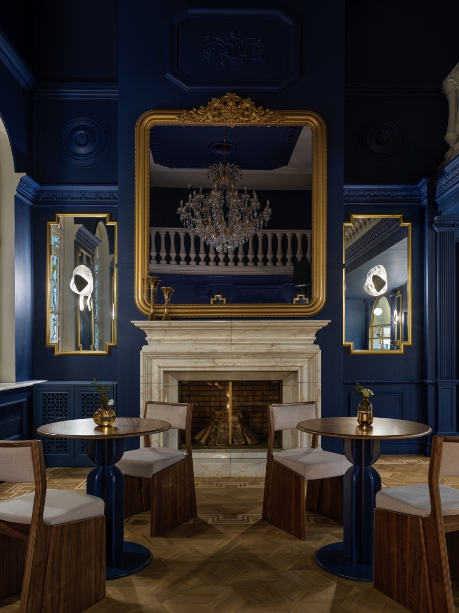 Синий зал. Над камином «парит» большое зеркало в золоченой раме, в лучших традициях усадебных домов. В нем также замаскирован большой экран от Burgglass для проведения лекций и семинаров. Стулья и столы с ножками в цвет стен выполнены на заказ в Unika Moblar. Синий зал. Над камином «парит» большое зеркало в золоченой раме, в лучших традициях усадебных домов. В нем также замаскирован большой экран от Burgglass для проведения лекций и семинаров. Стулья и столы с ножками в цвет стен выполнены на заказ в Unika Moblar.