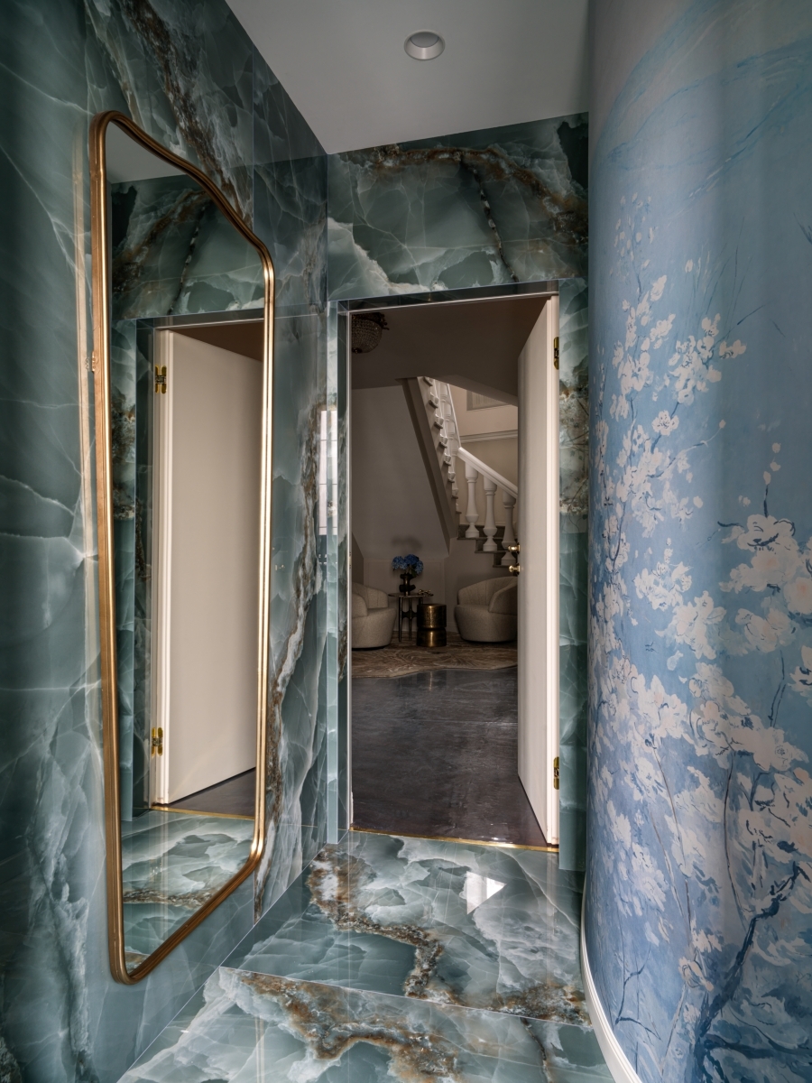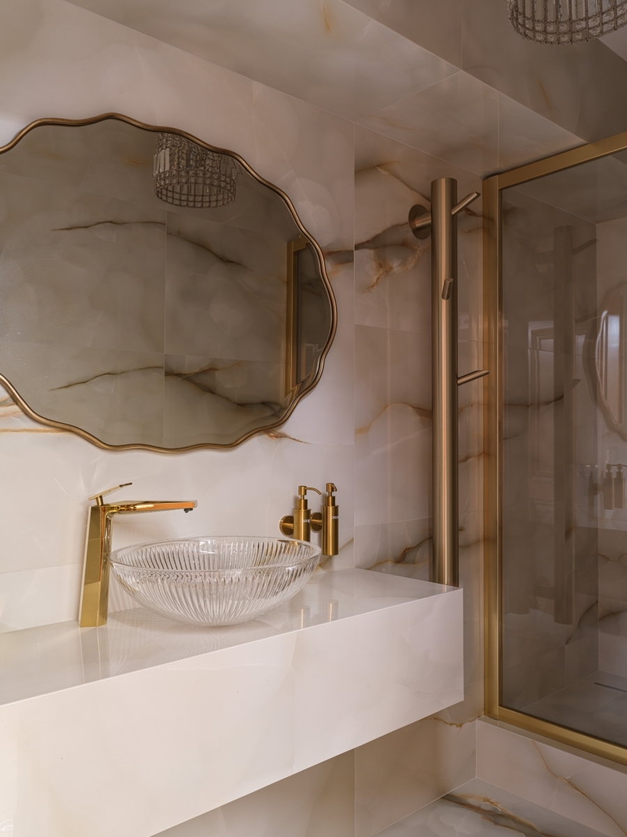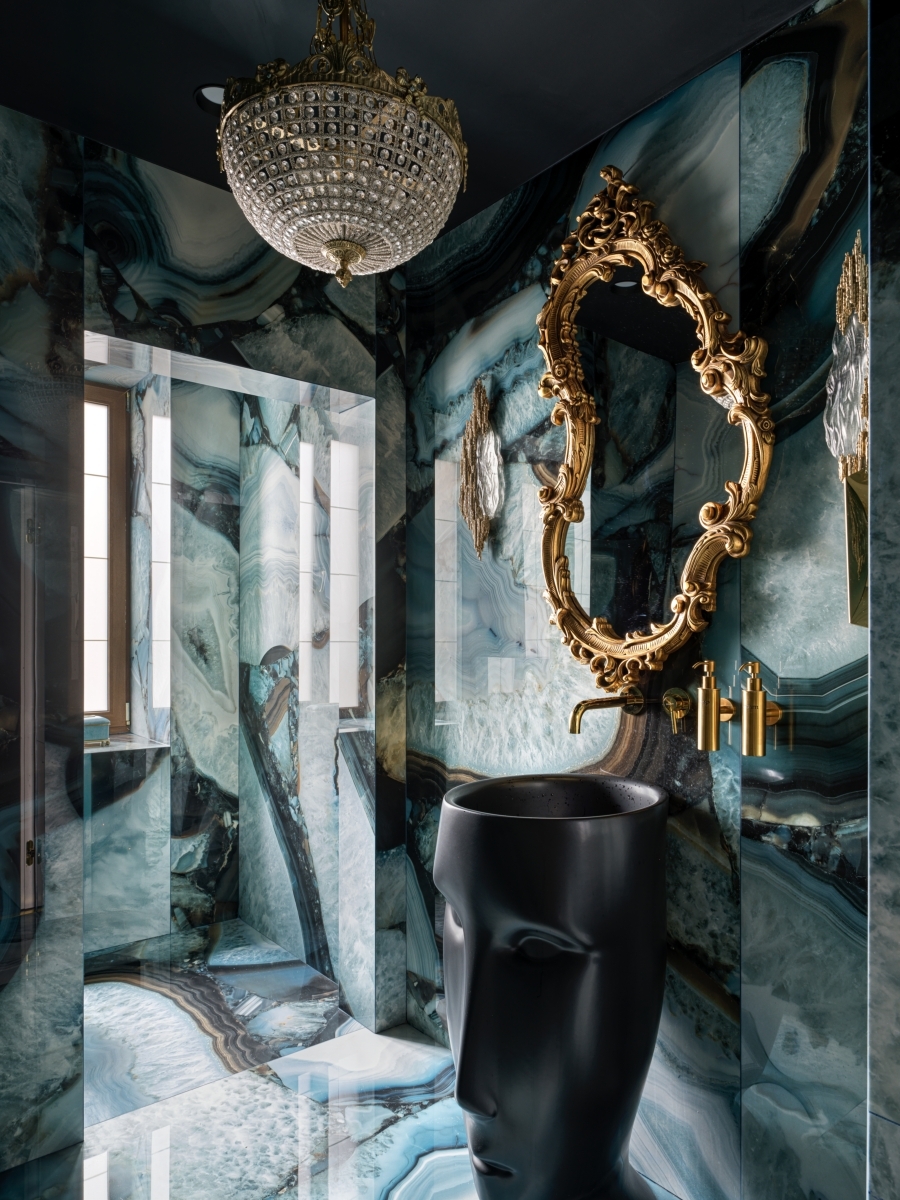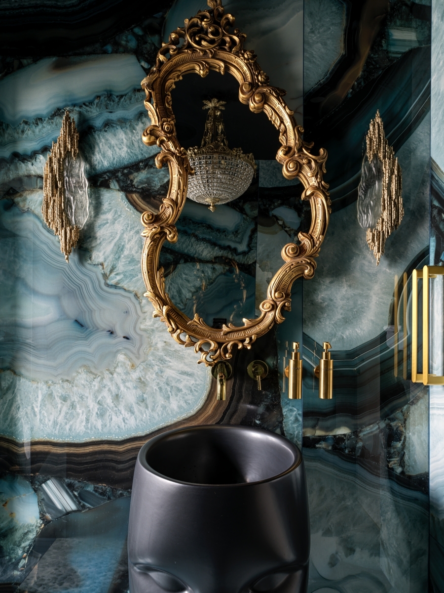 Ресепшен дополняет изящный акцент — золотой шар, расположенный по центру и притягивающий всеобщее внимание. Для зоны ожидания была выбрана мебель от Unika Moblar. Эргономика диванов и кресел с адаптивной поддержкой поясницы позволяет гостям расслабиться, будь то краткий визит или долгое ожидание. Продуманные детали, такие как регулируемый угол наклона, обеспечивают особый уровень удобства, делая время ожидания приятным ритуалом. Даже санузлы были преображены в настоящие арт-объекты. Татьяна и Сандра сделали два кардинально разных пространства, используя широкоформатную итальянскую плитку и сантехнику. Первый санузел, выполненный в светло-голубой гамме, украшен ручной росписью с мотивами райского сада. А второй, темный, напоминает волшебную шкатулку с керамогранитом с рисунком агата.