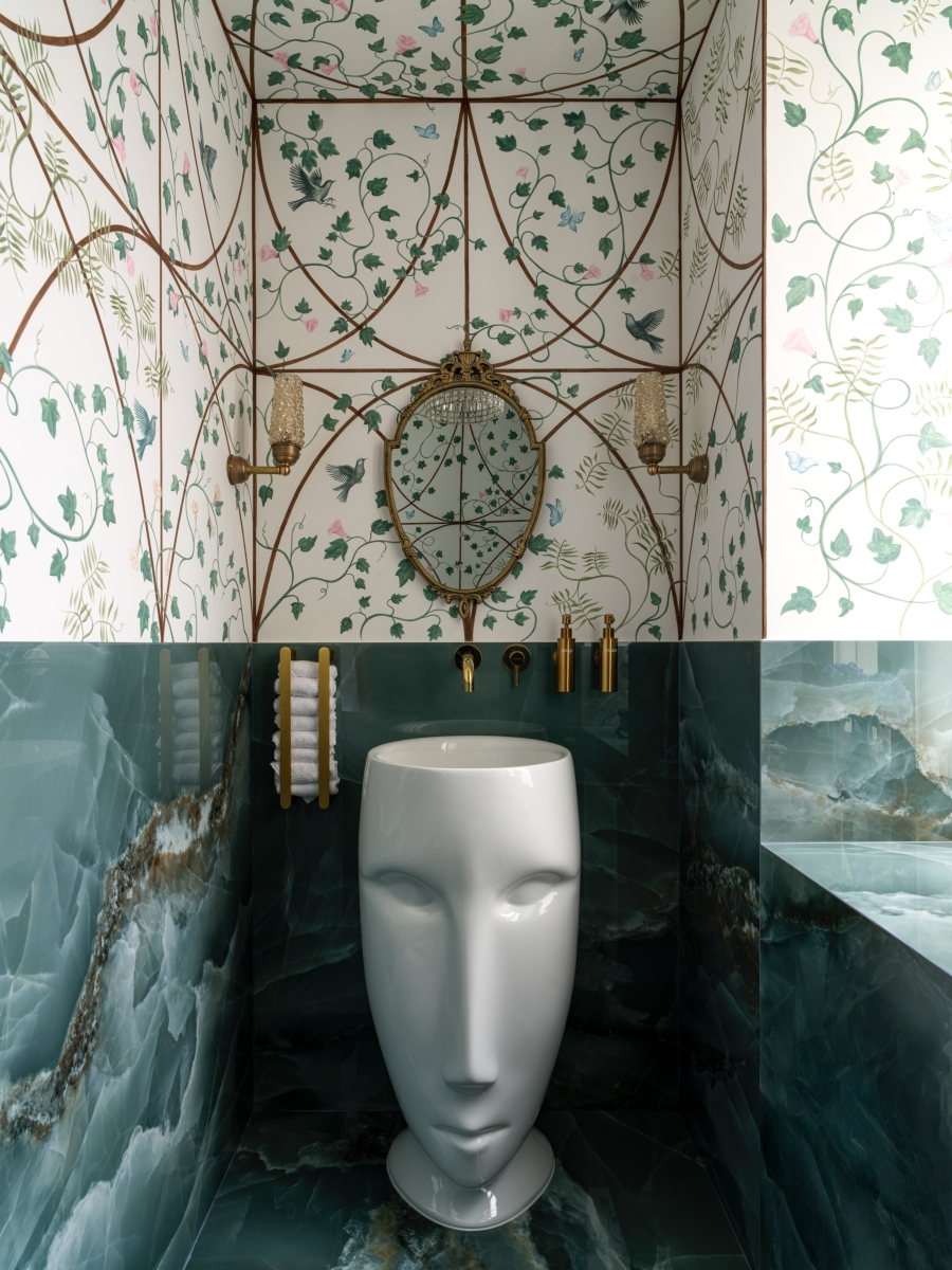 Санузел. На стене вручную выполнена роспись с мотивами райского сада — вьюны, цветы и птицы. Плитка, напольная раковина-голова, Ardo Studio. Винтажное зеркало и люстра начала ХХ века, Woodstream. Бра, Vetvi. Санузел. На стене вручную выполнена роспись с мотивами райского сада — вьюны, цветы и птицы. Плитка, напольная раковина-голова, Ardo Studio. Винтажное зеркало и люстра начала ХХ века, Woodstream. Бра, Vetvi.