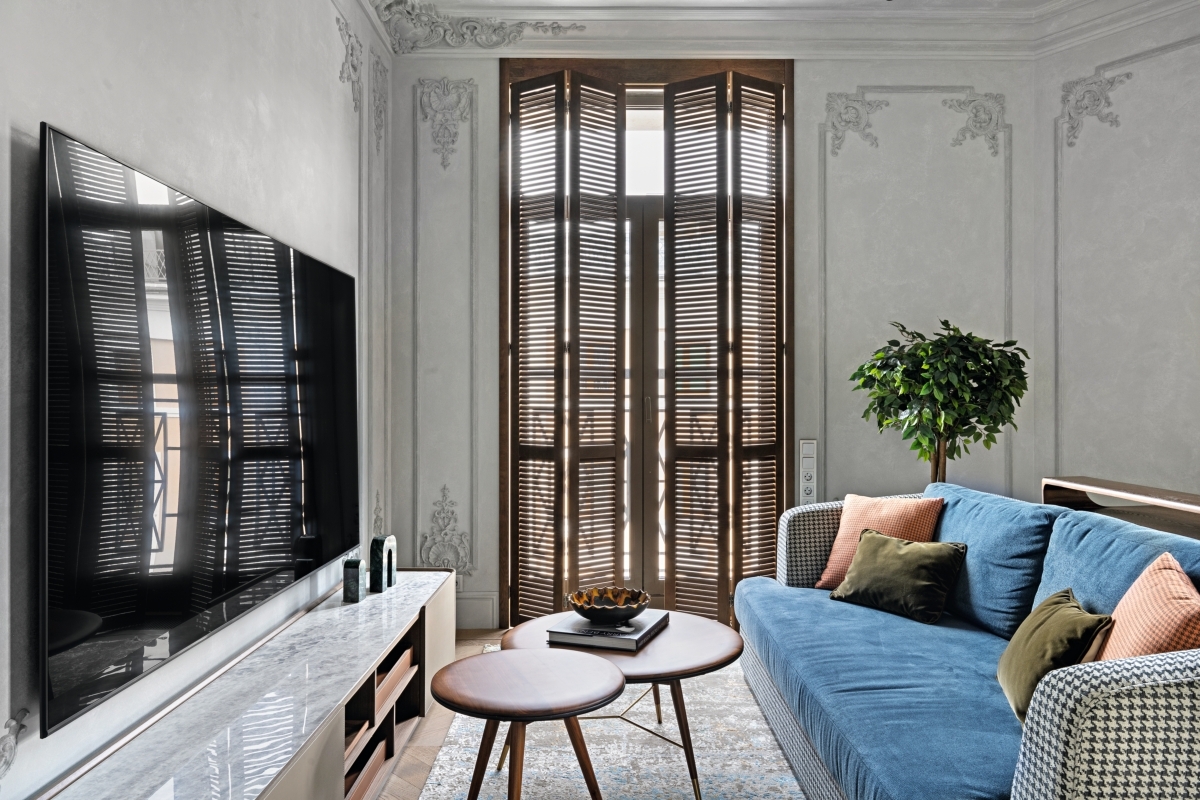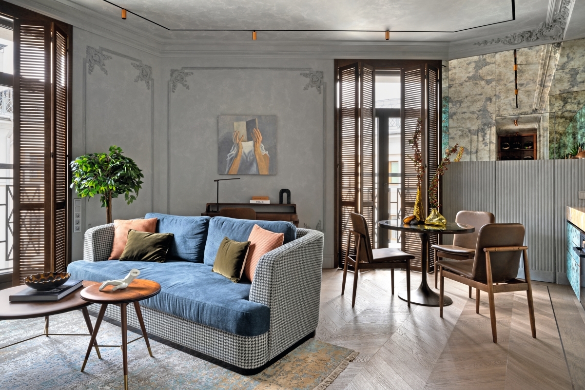 Визуальной доминантой в гостиной стал диван от Lavsit с обивкой из велюра глубокого синего цвета и боковыми панелями в ткани «гусиная лапка», который продолжает тему текстильной роскоши исторических интерьеров. Инженерная доска Coswik от Artdoor Regalett уложена классической французской елочкой — отсылка к историческим особнякам Европы. Светлый тон паркета помог сбалансировать насыщенные цвета мебели и отделки стен. Картина, Анастасия Геспер. Шаттерсы выполнены на заказ. Визуальной доминантой в гостиной стал диван от Lavsit с обивкой из велюра глубокого синего цвета и боковыми панелями в ткани «гусиная лапка», который продолжает тему текстильной роскоши исторических интерьеров. Инженерная доска Coswik от Artdoor Regalett уложена классической французской елочкой — отсылка к историческим особнякам Европы. Светлый тон паркета помог сбалансировать насыщенные цвета мебели и отделки стен. Картина, Анастасия Геспер. Шаттерсы выполнены на заказ.