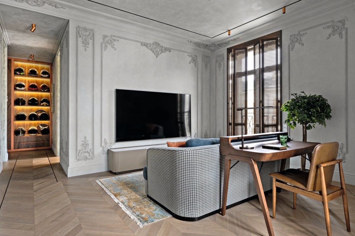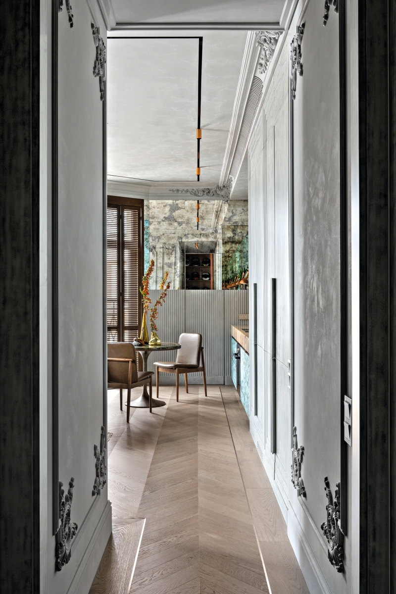 Заказчик хотел видеть в своей квартире дорогие, натуральные материалы с ощущением старины, которые сочетались бы с эстетикой самого дома, нового, но построенного в классическом стиле в историческом центре Москвы. Так в квартире появились стены с эффектом потертой замши и фактурные состаренные двери. «Демонстративно оставленная розетка под люстру выступает как «шрам времени», нарочито напоминающий о прошлых интерьерах, которых тут не было», — поясняет дизайнер. Уже прихожая погружает в необходимую атмосферу: шпонированные американским орехом шкафы и краска с легкой патиной повторяют отделку общественных зон жилого комплекса, обеспечивая гармоничный переход из лобби дома в частное пространство владельца. Паркетная «елочка» с инкрустацией и многослойные зеркальные панели создают утонченную эстетику исторического пространства. Здесь же, в специально разработанном стеллаже, хранится коллекция шлемов — еще одно хобби заказчика.