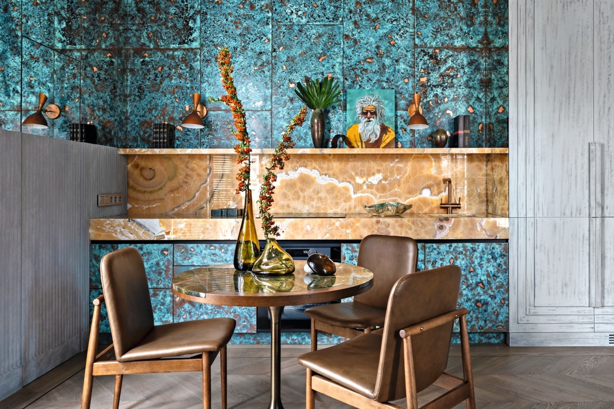 На базе классики дизайнеру предстояло объединить разные стили и мотивы, чтобы создать уникальный проект. Современность представлена лаконичной мебелью и логикой планировок. Сложные благородные оттенки — серый, зеленый, терракотовый — поддержаны более яркими акцентами: бирюзовыми панелями на кухне, оранжевым изголовьем. А абстрактные арт-объекты и вазы добавляют богемную ноту — Маргарита Посухова добавила в интерьер современные картины Анастасии Геспер. Некоторые детали отсылают к архитектуре и культуре Абхазии, откуда владелец родом: например, мраморная мозаика в душевой напоминает о знаменитой колоннаде в Гаграх, а из окисленной меди, характерной для традиционного абхазского декора, изготовлены фасады кухни. Этот материал, который великолепно патинируется и стареет, рифмуется с кухонными бра: дизайнер сама красила их медной краской по металлу.