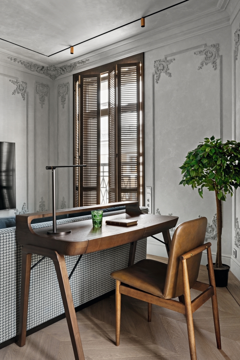 В основе проекта — неоклассика: карнизы, лепные орнаменты на потолках, геометрически выверенные панели. Эти элементы придают пространству ощущение наследия и статусности. «На классическом фундаменте строится более дерзкая, актуальная композиция, включающая элементы стиля mid-century, выразительные арт-объекты и предметы декора, отражающие дух времени. В результате интерьер получился не тиражным, а по‑настоящему «собранным» под конкретного человека», — рассказывает Маргарита Посухова.