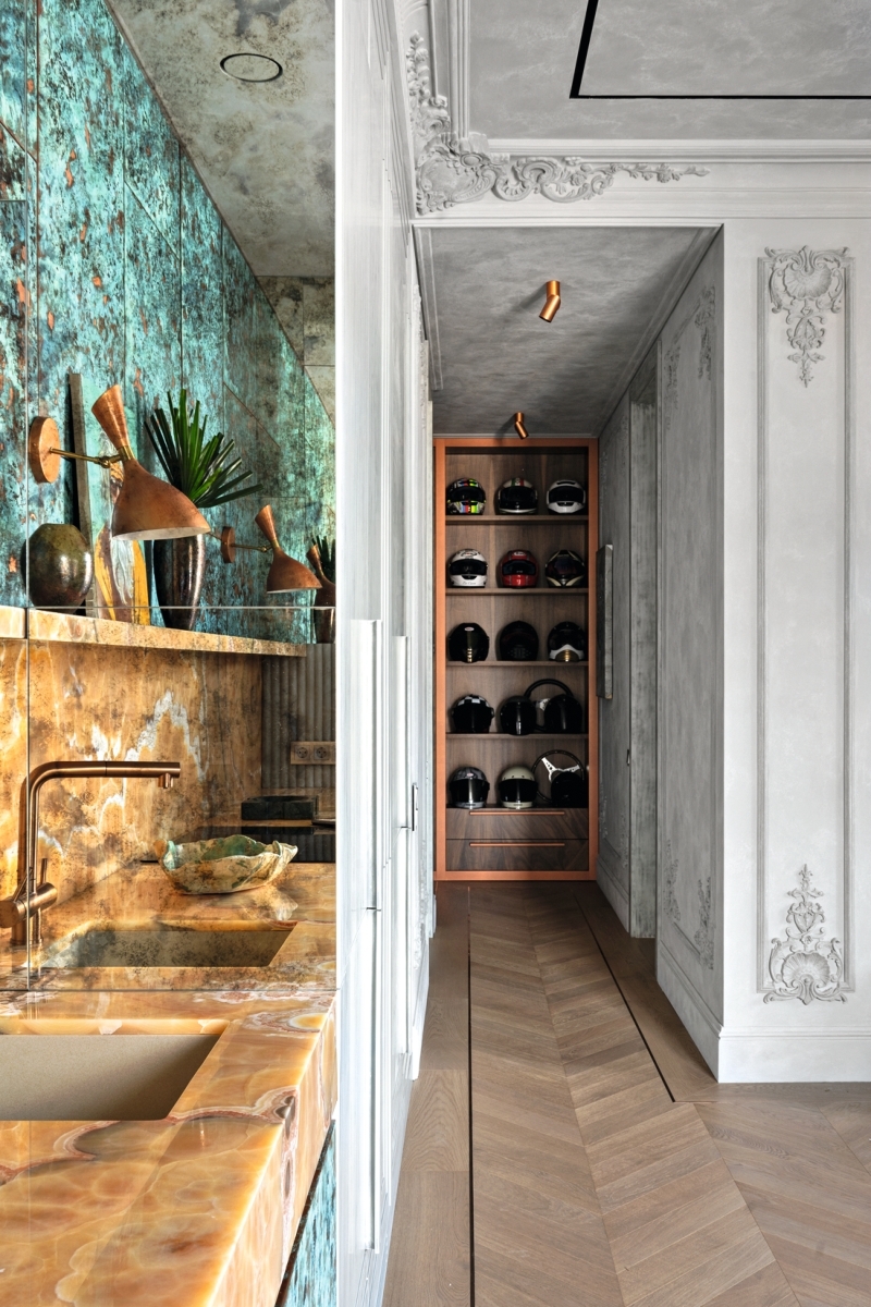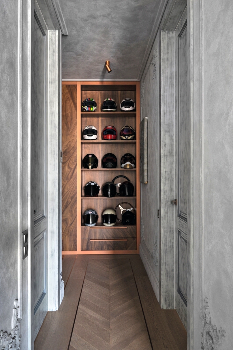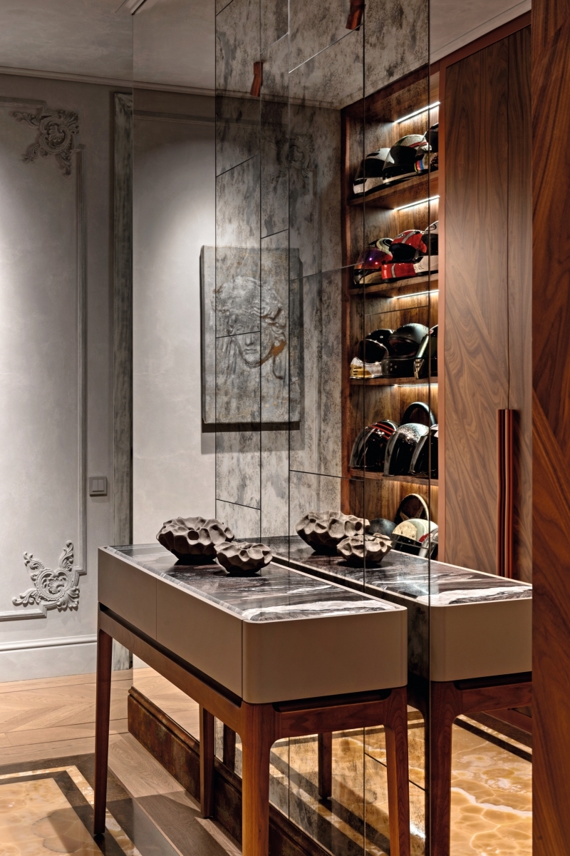 Важная деталь оформления прихожей, отражающая хобби владельца и одновременно арт-объект, — стеллаж для хранения шлемов с подсветкой, инкрустацией шпона и вставками из медной краски. Он создан по индивидуальному проекту Маргариты Посуховой компанией Sofia Glinova. Межкомнатные двери от Artdoor regaliett с отделкой под старину выполнены на заказ по дизайну автора проекта. Важная деталь оформления прихожей, отражающая хобби владельца и одновременно арт-объект, — стеллаж для хранения шлемов с подсветкой, инкрустацией шпона и вставками из медной краски. Он создан по индивидуальному проекту Маргариты Посуховой компанией Sofia Glinova. Межкомнатные двери от Artdoor regaliett с отделкой под старину выполнены на заказ по дизайну автора проекта.