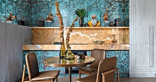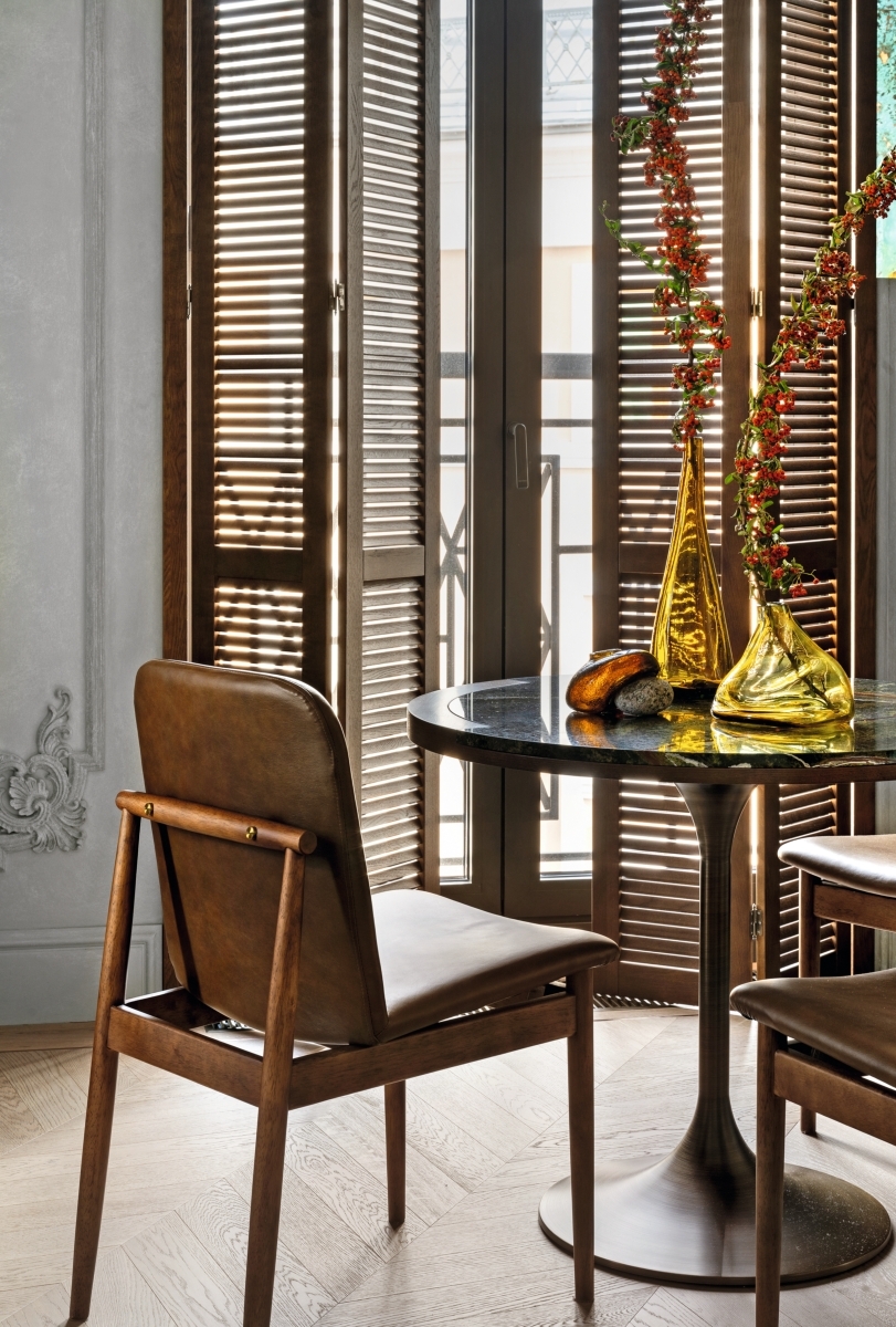 Зона столовой. «Обеденный стол Stone&Home в стиле mid-century с каменной столешницей и основанием-тюльпаном, а также стулья с кожаной обивкой и деревянным каркасом формируют более современный, комфортный облик, подчеркивая, что апартаменты предназначены для сегодняшнего образа жизни, несмотря на вдохновение прошлым», — отмечает автор проекта.