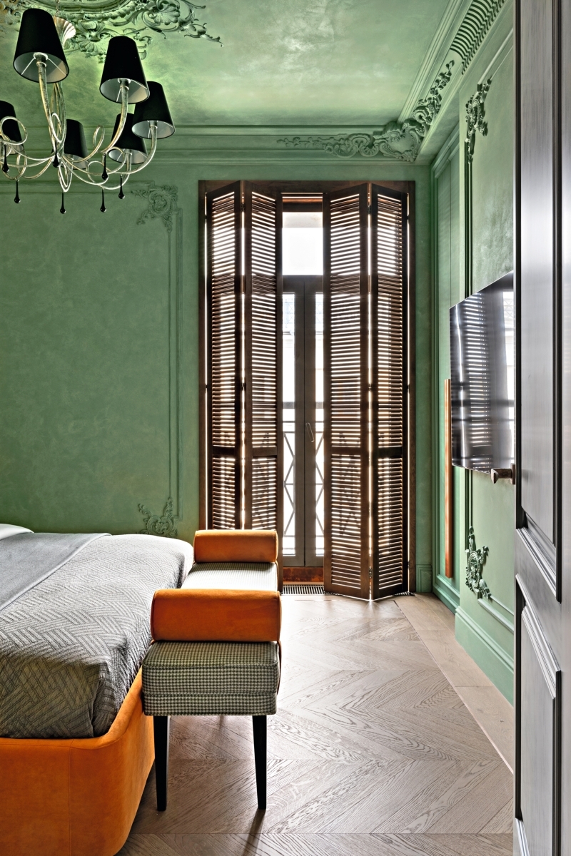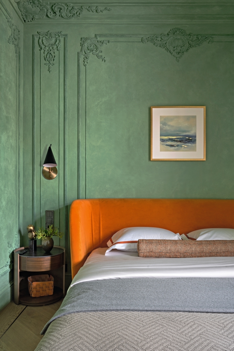Фоном в спальне служит травяной зеленый оттенок — одинаковый для стен и потолка, что подчеркивает сложную лепнину розеток. Энергичные акценты — изголовье кровати и подлокотники банкетки, выполненные в оранжевом бархате Hermes. Банкетка перекликается с диваном в гостиной — ее сиденье обито тканью с орнаментом «гусиная лапка». Фоном в спальне служит травяной зеленый оттенок — одинаковый для стен и потолка, что подчеркивает сложную лепнину розеток. Энергичные акценты — изголовье кровати и подлокотники банкетки, выполненные в оранжевом бархате Hermes. Банкетка перекликается с диваном в гостиной — ее сиденье обито тканью с орнаментом «гусиная лапка».