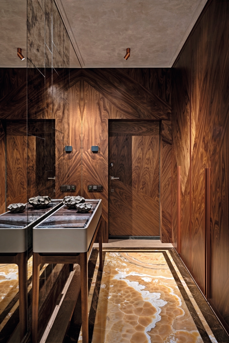 Так как место в санузле пришлось экономить, стиральную машинку спрятали в шкафу в прихожей. У заказчика много обуви, поэтому там же разместились полки для хранения 100 пар, а для одежды предусмотрены места в спальне и в гостиной. На полу — паркет с укладкой «елочка», инкрустацией элементов из оникса и вставками медного цвета анодированного профиля, отсылающими к основным материалам кухонной зоны и ванной. Стены окрашены краской с легкой патиной, шкафы в шпоне из американского ореха изготовлены компанией Sofia Glinova. «Заказчики сейчас больше уделяют внимания искусству, каким‑то персонализированным вещам, — отмечает Маргарита. — В этом есть заслуга искусственного интеллекта, ведь теперь любой предмет можно «примерить» к интерьеру. Повышается насмотренность, заказчики стали больше ценить красоту и стремятся к компромиссу между эстетикой и удобством». Так как место в санузле пришлось экономить, стиральную машинку спрятали в шкафу в прихожей. У заказчика много обуви, поэтому там же разместились полки для хранения 100 пар, а для одежды предусмотрены места в спальне и в гостиной. На полу — паркет с укладкой «елочка», инкрустацией элементов из оникса и вставками медного цвета анодированного профиля, отсылающими к основным материалам кухонной зоны и ванной. Стены окрашены краской с легкой патиной, шкафы в шпоне из американского ореха изготовлены компанией Sofia Glinova. «Заказчики сейчас больше уделяют внимания искусству, каким‑то персонализированным вещам, — отмечает Маргарита. — В этом есть заслуга искусственного интеллекта, ведь теперь любой предмет можно «примерить» к интерьеру. Повышается насмотренность, заказчики стали больше ценить красоту и стремятся к компромиссу между эстетикой и удобством».