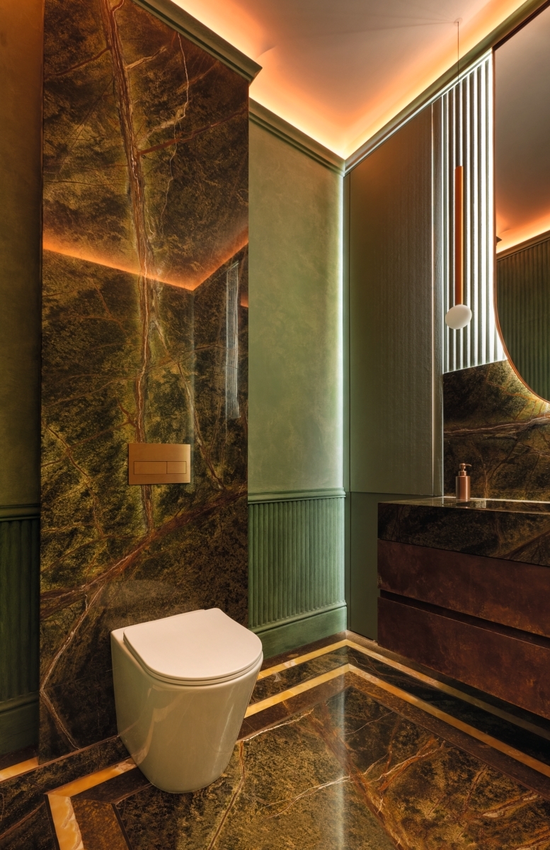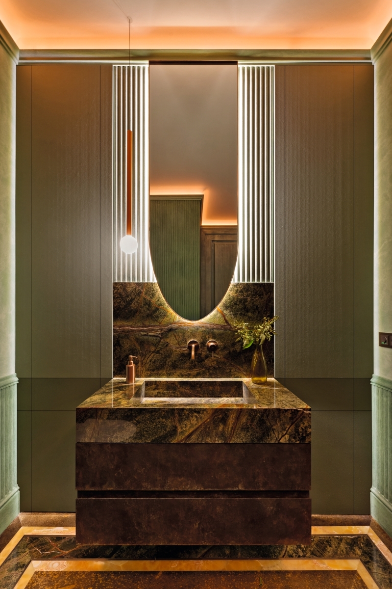 В ванной прослеживаются роскошь и геометрия ар-деко. На полу использован зеленый мрамор bidasar green с инкрустацией из Emperador dark и медных вставок от Stone&Home. Стены частично облицованы этим же камнем, частично выкрашены в спокойный пыльно-зеленый оттенок. Раковина — монолитная, выполнена из того же зеленого мрамора компанией Stone&Home и визуально перекликается с напольным покрытием. В ванной прослеживаются роскошь и геометрия ар-деко. На полу использован зеленый мрамор bidasar green с инкрустацией из Emperador dark и медных вставок от Stone&Home. Стены частично облицованы этим же камнем, частично выкрашены в спокойный пыльно-зеленый оттенок. Раковина — монолитная, выполнена из того же зеленого мрамора компанией Stone&Home и визуально перекликается с напольным покрытием.