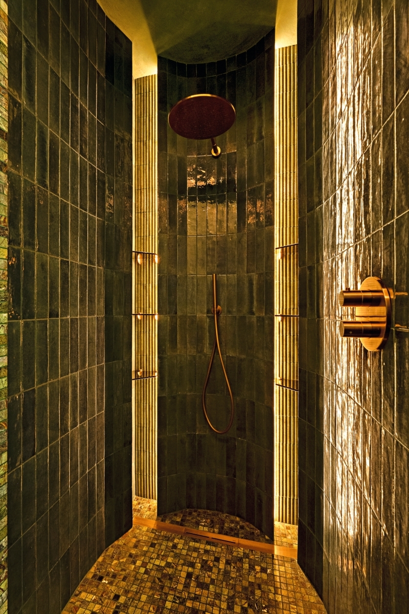 На полу душевой — мозаика из мрамора Badisar Green от Stone&Home. На полу душевой — мозаика из мрамора Badisar Green от Stone&Home.