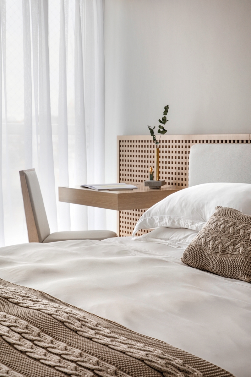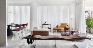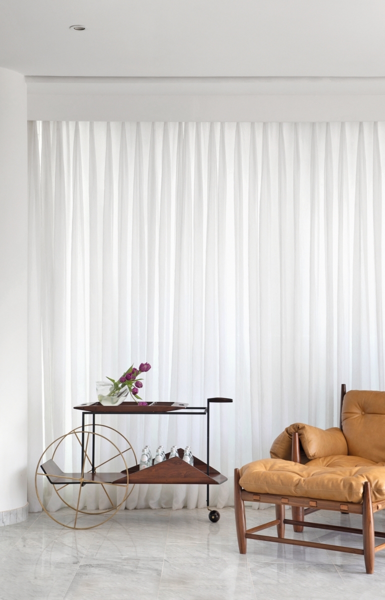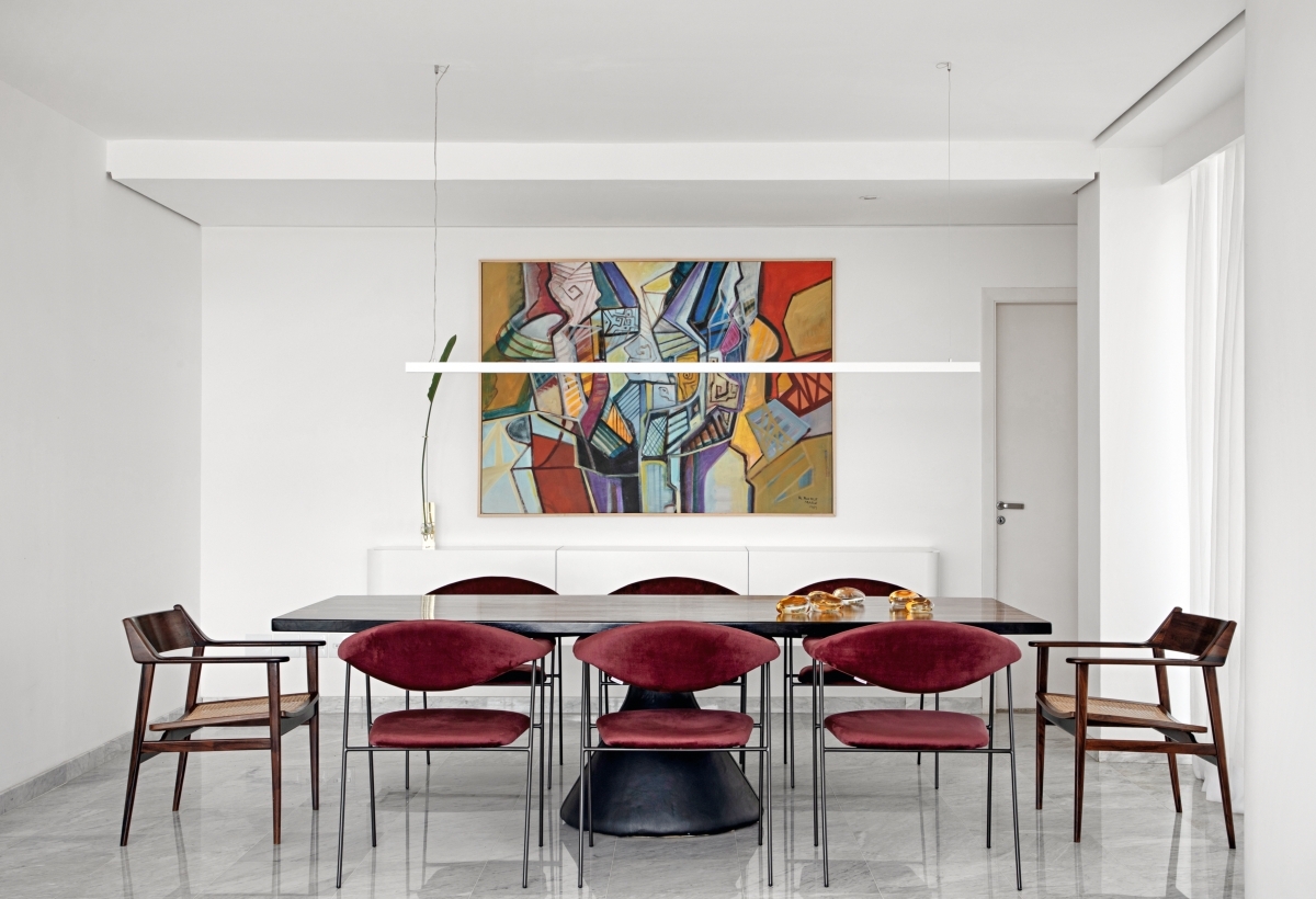 В гостиной главными предметами, определяющими интерьер, становятся скамья Onda Хорхе Зальзупина, выполненная из розового дерева — любимого материала всего бразильского модернизма, а также кресло Жана Гийона Jangada. «Фишка» последнего — веревочный каркас, поддерживающий сиденье и подушку спинки. Также в дизайне кресла использована классическая бразильская древесина жакаранда и карамельная кожа. В столовой солирует дуэт из обеденного стола Guanabara на бетонном основании, того же Хорхе Зальзупина, и стулья уже современного модерниста, подхватившего флаг прославившего страну стиля, Дзанини де Дзанина. Во главе стола красуется еще одна икона дизайна — стулья эпохи классического бразильского модернизма авторства Серхио Родригеса, пик популярности которого пришелся на 1960‑е.