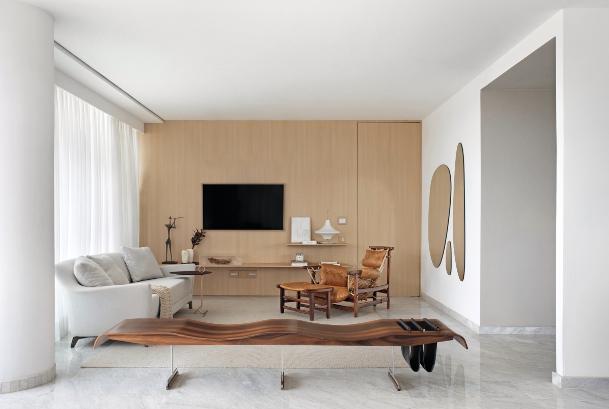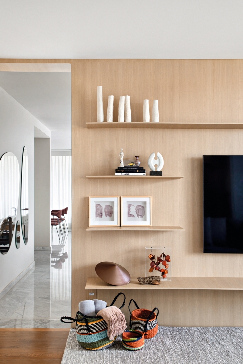 На площади в 300 кв. м это просторная двухчастная гостиная: с ТВ-зоной и лаунджем, столовая с небольшой кухонной зоной, рабочее пространство и две спальни, включая гостевую. Для выразительной мебели и арта нужен был выигрышный фон, и архитекторы постарались создать максимально нейтральное окружение, которое не спорило бы с ключевыми элементами дизайна. По части реставрации восстановили мраморные полы во всей квартире и выбелили стены, в некоторых местах добавив панели из светлого дерева. Текстиль в спокойных тонах и лаконичные аксессуары в монохромной стилистике довершают палитру фона.