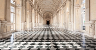 Идеальный образец шахматного пола XVIII века, созданный в рамках масштабной перестройки дворца архитектором Микеланджело Гарове в 1699-1713 годах. 80-метровая Большая галерея (также называемая Галереей Дианы) соединяла апартаменты короля Карла Эммануила III и его наследника — будущего герцога Савойского, служив парадным проходом между покоями монархов.