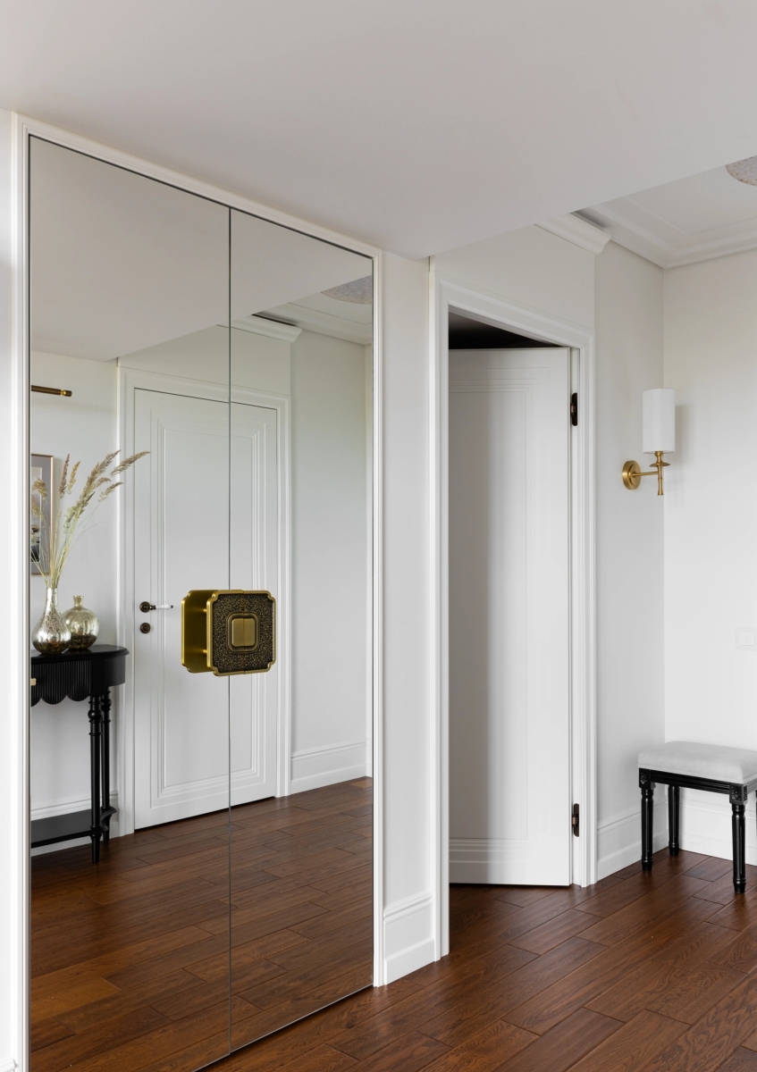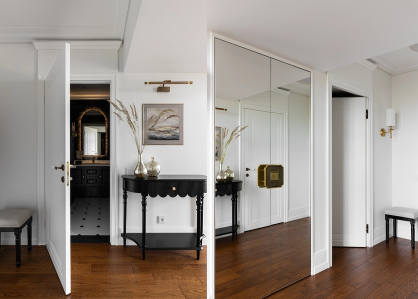 При входе установлена консоль для мелочей, куда можно положить ключи, часы, очки или сумки. За открытой дверью слева — санузел; за дверью справа — вход в гардеробную. Особой шарм прихожей придает встроенный шкаф с зеркальными фасадами и массивной ручкой из латуни в азиатском стиле. При входе установлена консоль для мелочей, куда можно положить ключи, часы, очки или сумки. За открытой дверью слева — санузел; за дверью справа — вход в гардеробную. Особой шарм прихожей придает встроенный шкаф с зеркальными фасадами и массивной ручкой из латуни в азиатском стиле.