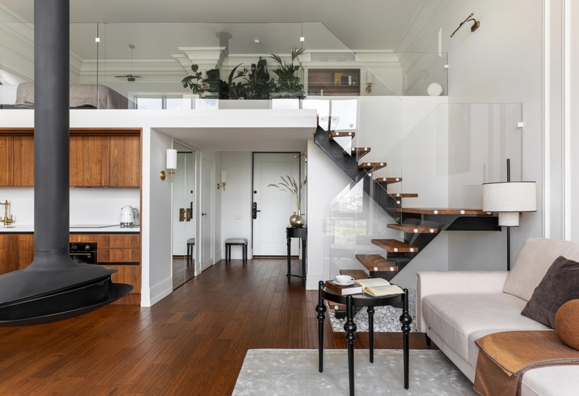 Изначально площадь квартиры составляла 50 кв. метров, но за счет высоких потолков архитекторы превратили ее в двухуровневую, увеличив жилую площадь.