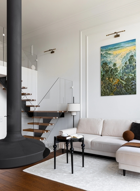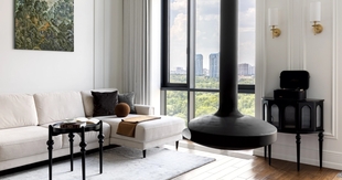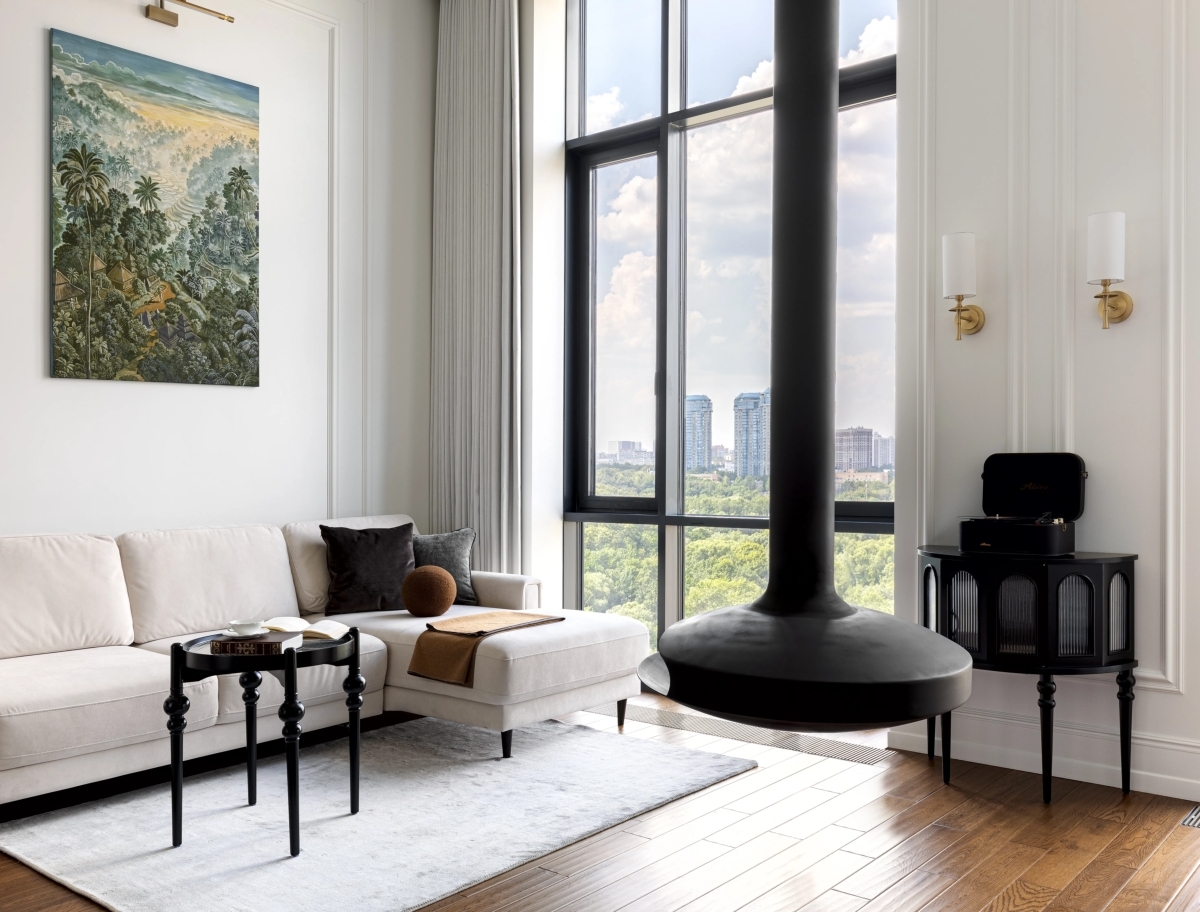 Зона гостиной. Еще одной особенностью проекта стало то, что квартира расположена на верхнем этаже, в пентхаусе. От застройщика в перекрытии уже была предусмотрена технологическая ниша — отверстие под дымоход, предназначенное для установки камина. Это стало прекрасной возможностью реализовать эффектное интерьерное решение. «Мы решили подчеркнуть этот элемент и сделать камин не просто функциональной деталью, а главным акцентом пространства. — отмечает Мариетта. — В зоне гостиной появился подвесной, словно парящий в воздухе камин — изящный и современный. Он придает интерьеру ощущение лёгкости и динамики, создавая эффект визуальной воздушности. Этот элемент не только украшает пространство, но и формирует особую атмосферу уюта и тепла — идеальную для долгих вечеров, когда можно расслабиться, наслаждаясь огнем и видом на город». Диван, компания «Трэви». На стенах — краска Little Greene. Камин Gyrofocus, Focus. Зона гостиной. Еще одной особенностью проекта стало то, что квартира расположена на верхнем этаже, в пентхаусе. От застройщика в перекрытии уже была предусмотрена технологическая ниша — отверстие под дымоход, предназначенное для установки камина. Это стало прекрасной возможностью реализовать эффектное интерьерное решение. «Мы решили подчеркнуть этот элемент и сделать камин не просто функциональной деталью, а главным акцентом пространства. — отмечает Мариетта. — В зоне гостиной появился подвесной, словно парящий в воздухе камин — изящный и современный. Он придает интерьеру ощущение лёгкости и динамики, создавая эффект визуальной воздушности. Этот элемент не только украшает пространство, но и формирует особую атмосферу уюта и тепла — идеальную для долгих вечеров, когда можно расслабиться, наслаждаясь огнем и видом на город». Диван, компания «Трэви». На стенах — краска Little Greene. Камин Gyrofocus, Focus.