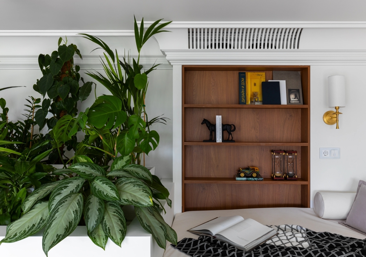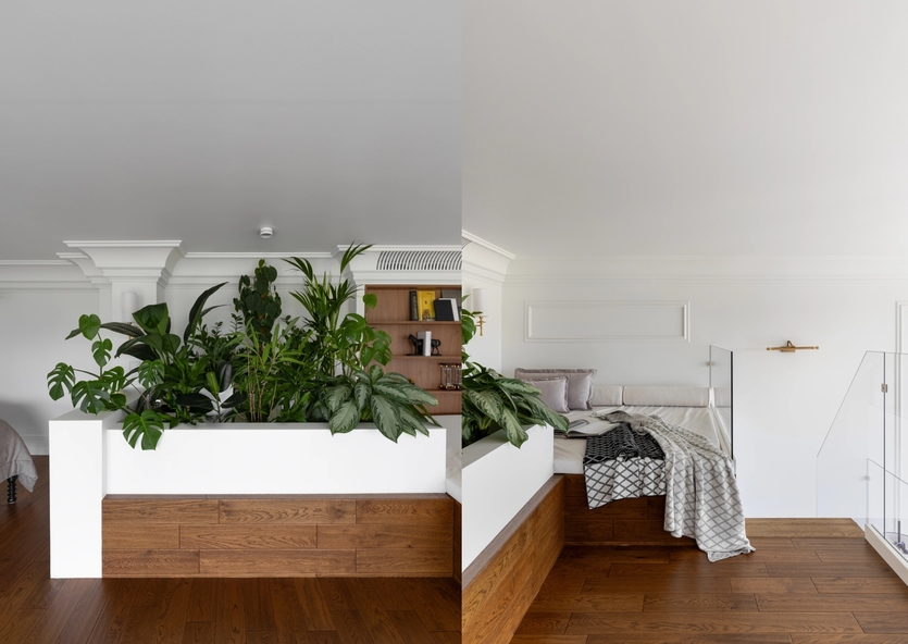 Особую атмосферу на верхнем уровне создаёт уютное пространство для отдыха и чтения зона — татами с растениями и небольшой библиотекой. «Идею двухуровневой конструкции предложила сама заказчица, — поясняет Мариетта. — Мы долго искали оптимальное решение, но именно её идея позволила объединить функциональность и эстетику. Заказчица — большая любительница тропической природы, и мечтала о собственном уголке зелени в квартире. Так появился зимний сад, ставший не только эстетическим акцентом, но и отражением её увлечений. Кроме того, в зимнем саду предусмотрена специальная система автоматического полива и ухода за растениями. Это позволяет им расти и радовать своим видом даже в периоды, когда хозяева уезжают в очередное путешествие. Таким образом, зимний сад не требует дополнительного ухода и остаётся живым и гармоничным элементом интерьера в любое время». Особую атмосферу на верхнем уровне создаёт уютное пространство для отдыха и чтения зона — татами с растениями и небольшой библиотекой. «Идею двухуровневой конструкции предложила сама заказчица, — поясняет Мариетта. — Мы долго искали оптимальное решение, но именно её идея позволила объединить функциональность и эстетику. Заказчица — большая любительница тропической природы, и мечтала о собственном уголке зелени в квартире. Так появился зимний сад, ставший не только эстетическим акцентом, но и отражением её увлечений. Кроме того, в зимнем саду предусмотрена специальная система автоматического полива и ухода за растениями. Это позволяет им расти и радовать своим видом даже в периоды, когда хозяева уезжают в очередное путешествие. Таким образом, зимний сад не требует дополнительного ухода и остаётся живым и гармоничным элементом интерьера в любое время».