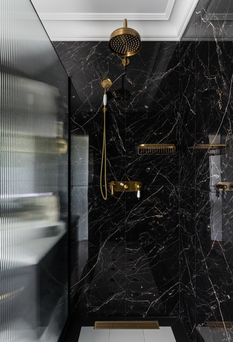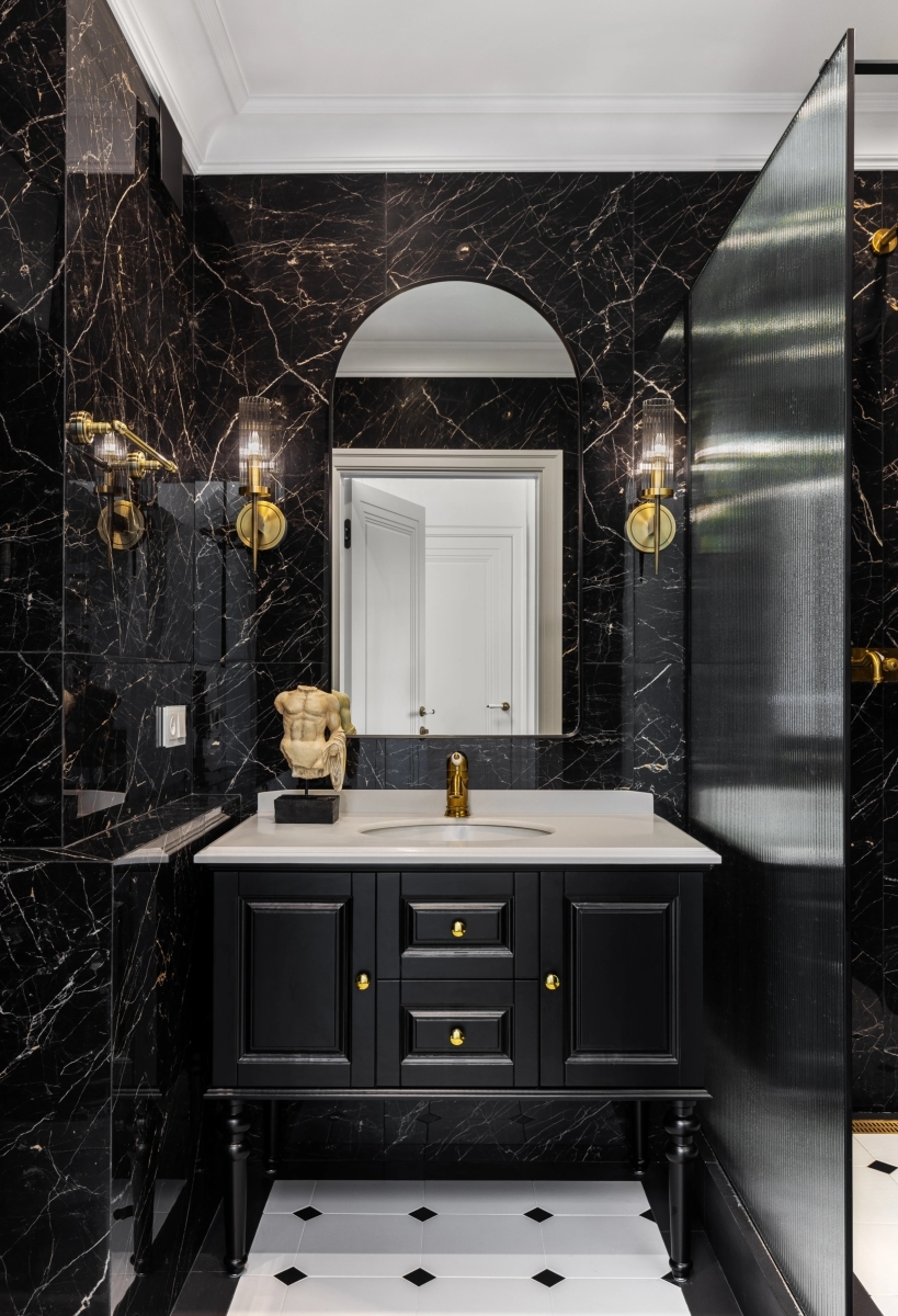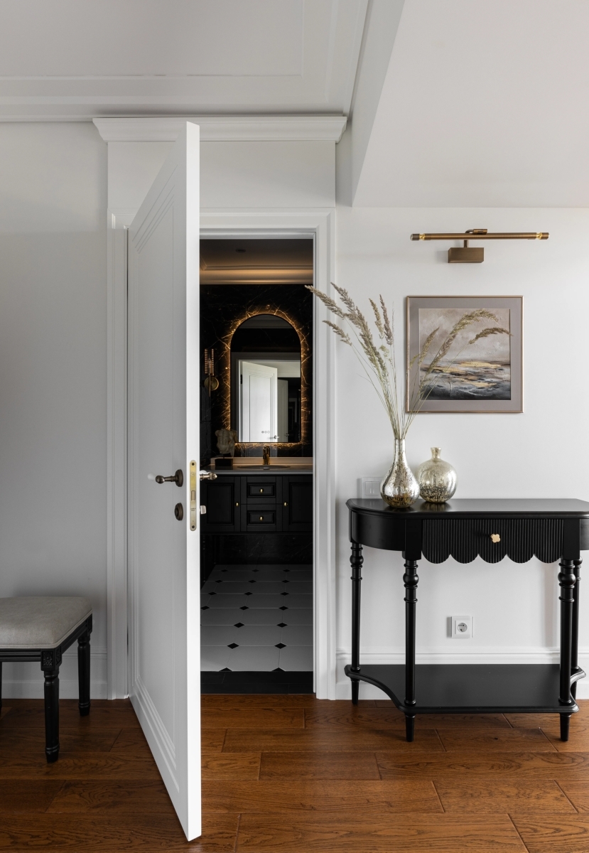 Цветовая палитра интерьера выдержана в спокойных тёпло-белых оттенках, которые стали основой всех помещений. Исключение составляет санузел — здесь выбран глубокий чёрный цвет и тёмная плитка, дополненные темной мебель под глянцевой эмалью. Однако за счёт высокого потолка пространство не кажется тяжёлым: наоборот, оно выглядит эффектным и акцентным, создаёт атмосферу уюта и современности.