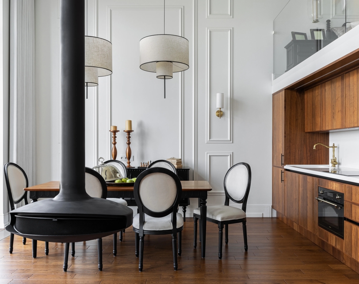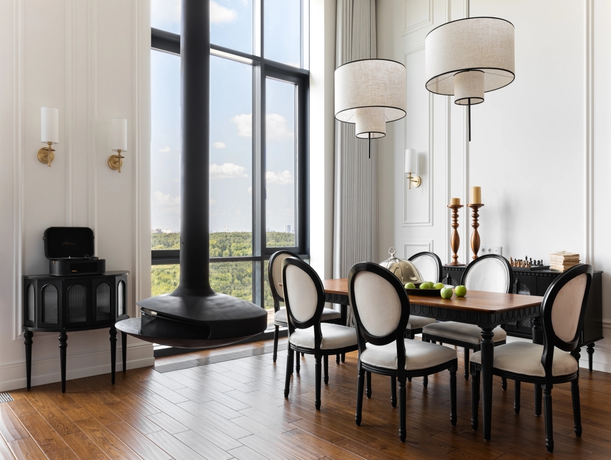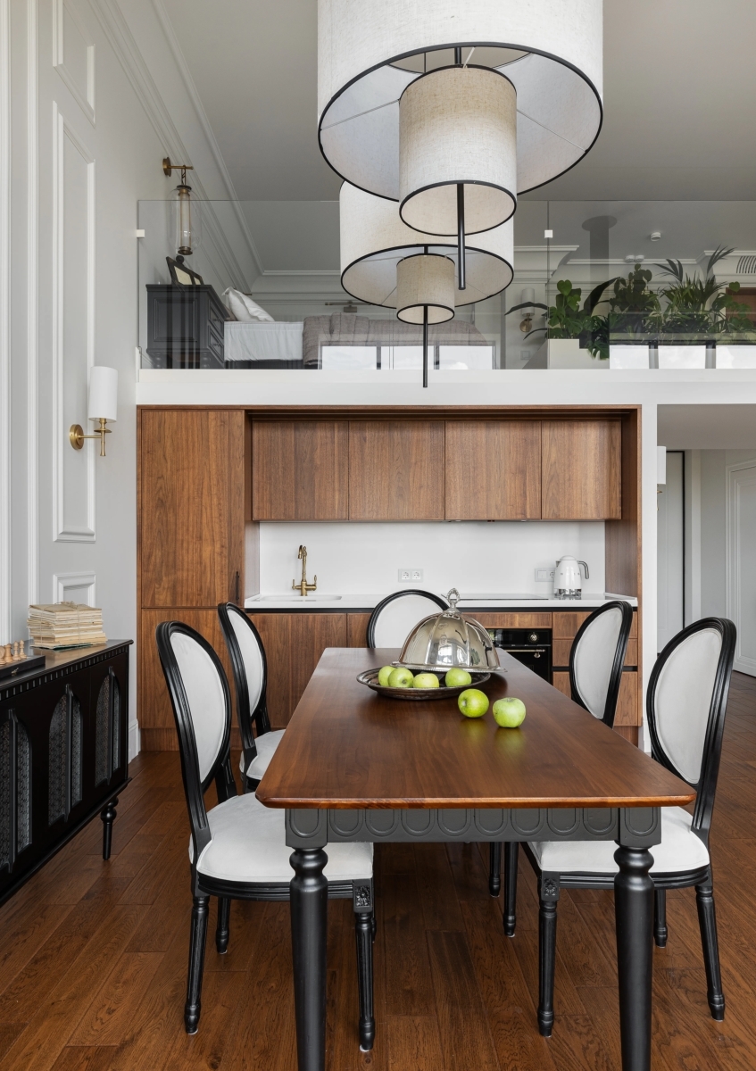 Мебель в интерьере подобрана исходя из стиля. Корпусная мебель (кухня, гардеробная, библиотека) выполнены в России по индивидуальным чертежам. Диван в гостиной — отечественного бренда. Остальная мебель (кровать, консоли, кресла, стулья) привезена из Китая. В ней использован чёрный МДФ с эмалевой покраской, что придало интерьеру современный и строгий акцент. Такое сочетание позволило создать гармоничное пространство, где сохранен баланс между уникальностью и практичностью.