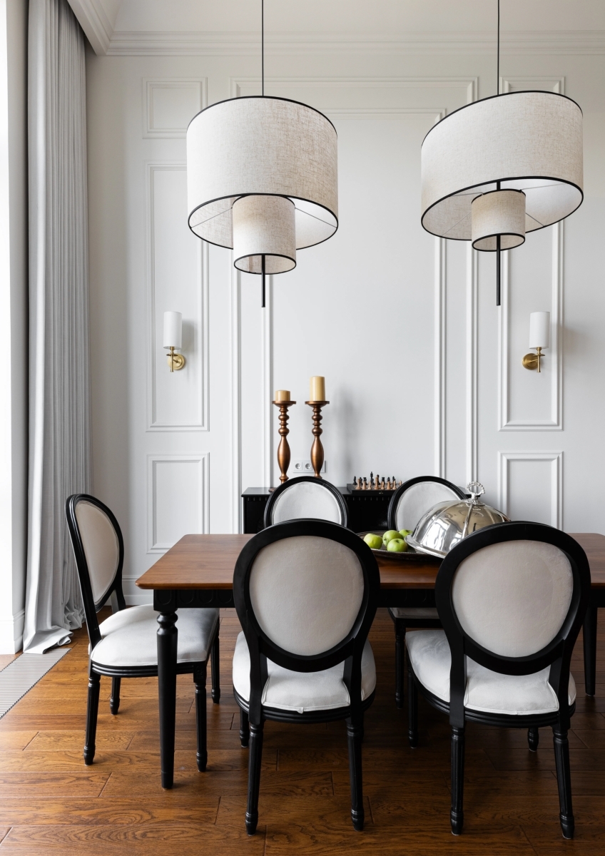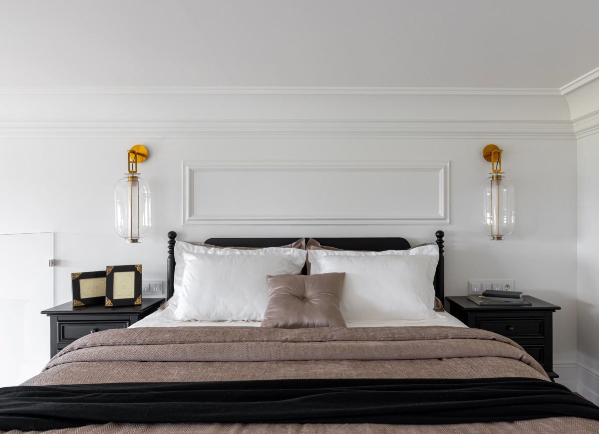 Дополнительный акцент создают масштабные декоративные элементы: крупные карнизы и молдинги. «Причём молдинги мы развернули нестандартным образом — они выглядят легче, словно «парят» в пространстве, создавая интересный объём, который подчёркивает интерьер, но не перегружает его», — объясняет прием автор проекта.