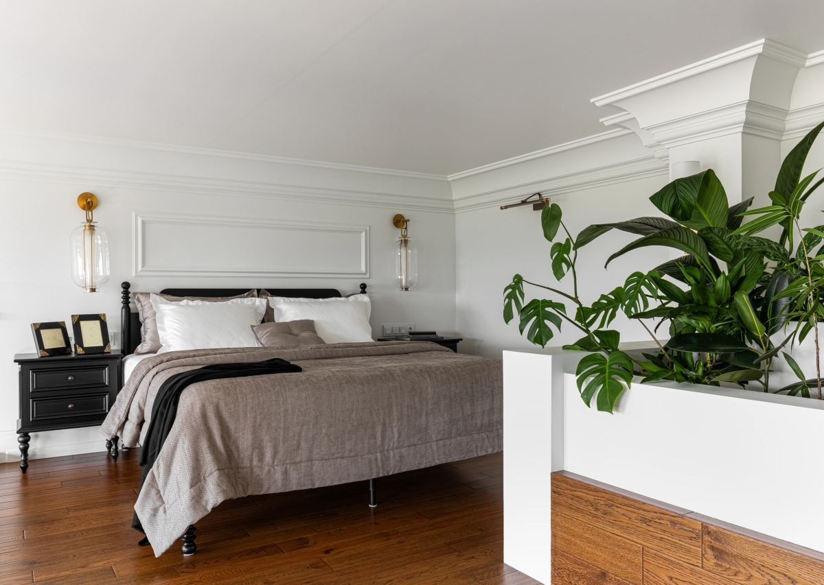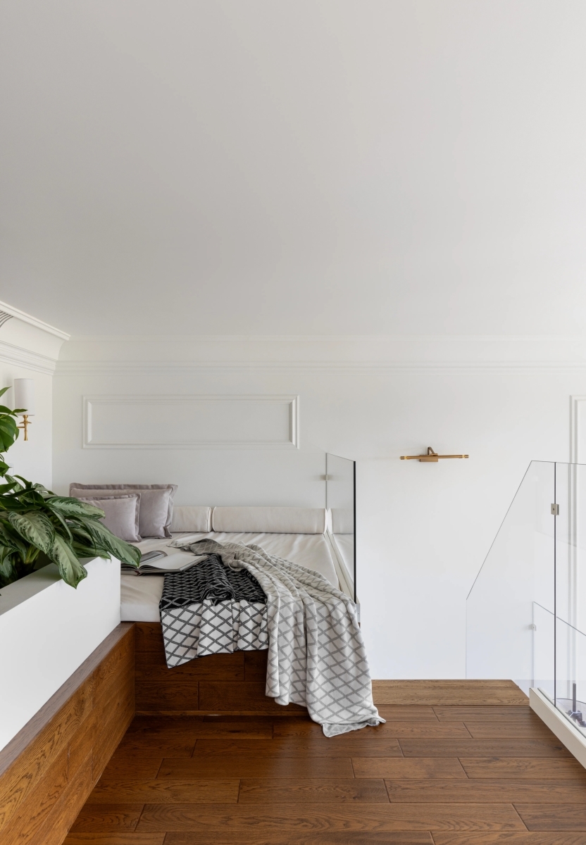 Из-за перепада высот и нестандартной входной двери высотой 2,3 м возникла сложность с планировкой второго, антресольного этажа. Если бы архитекторы сделали его на одном уровне, пространство оказалось бы слишком низким и некомфортным. Поэтому было принято решение создать двухуровневую антресоль, чтобы сохранить приятный и просторный вход в пентхаус и при этом сделать второй этаж удобным и эстетичным. В результате получилась интересная архитектурная композиция: зона санузла с высокими потолками, а рядом — пространство зимнего сада, расположенное выше основной зоны спальни. Так образовалась уютная зона отдыха в стиле татами, где можно читать, расслабляться и просто наслаждаться атмосферой.