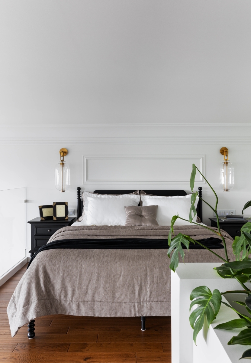 На антресольном уровне обустроена зона спальни. «Особое внимание мы уделяли деталям: молдинги на стенах были тщательно прорисованы и продуманы так, чтобы идеально совпадать с линиями и пропорциями интерьера. Несмотря на то, что архитектурные формы напоминали «кубики», они складывались в гармоничную композицию. Учитывали при расчете расположения декоративных элементов даже такие нюансы, как высота кровати», — отмечает Мариетта Мнацаканян. На антресольном уровне обустроена зона спальни. «Особое внимание мы уделяли деталям: молдинги на стенах были тщательно прорисованы и продуманы так, чтобы идеально совпадать с линиями и пропорциями интерьера. Несмотря на то, что архитектурные формы напоминали «кубики», они складывались в гармоничную композицию. Учитывали при расчете расположения декоративных элементов даже такие нюансы, как высота кровати», — отмечает Мариетта Мнацаканян.