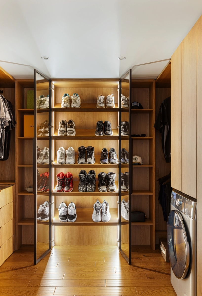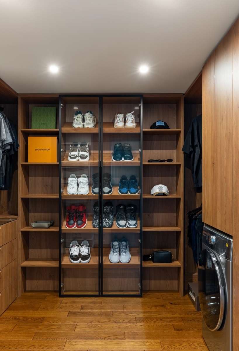 Система хранения в этой квартире продумана до мелочей. В каждой зоне предусмотрены свои системы, но для большого объема вещей предусмотрена просторная гардеробная на первом этаже, совмещенная с хозблоком, где установлены стиральная, сушильная машины и гладильная доска. Система хранения в этой квартире продумана до мелочей. В каждой зоне предусмотрены свои системы, но для большого объема вещей предусмотрена просторная гардеробная на первом этаже, совмещенная с хозблоком, где установлены стиральная, сушильная машины и гладильная доска.