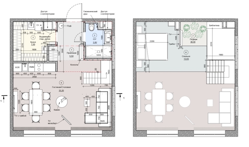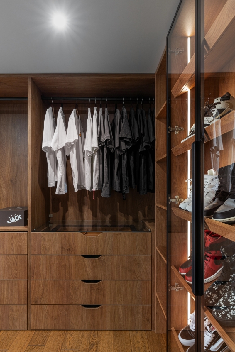 «По плану застройщика не было предусмотрено место для гардеробной, а заказчики хотели иметь просторное и функциональное помещение, где даже обувь будет красиво подсвечена (они коллекционируют интересные модели). Поэтому мы решили сделать квартиру двухуровневой, чтобы на первом этаже разместить удобную и вместительную гардеробную, — комментирует решение Мариетта. — Но был и второй важный момент: согласно исходной планировке, при входе в квартиру человек сразу упирался бы в стену и дверь спальни. Это перекрывало обзор, хотя квартира — пентхаус с потрясающим видом на лес. Нам важно было акцентировать внимание на этом пейзаже. Поэтому спальню мы подняли на верхний уровень. Теперь сразу от входа открывается великолепная перспектива с четырёхметровыми окнами в пол. Особенно эффектно это выглядит на закате — когда небо окрашивается в яркие краски, создаётся ощущение космической красоты. Если бы мы не сделали перепланировку, вся эта уникальность просто потерялась бы за стандартной стеной».