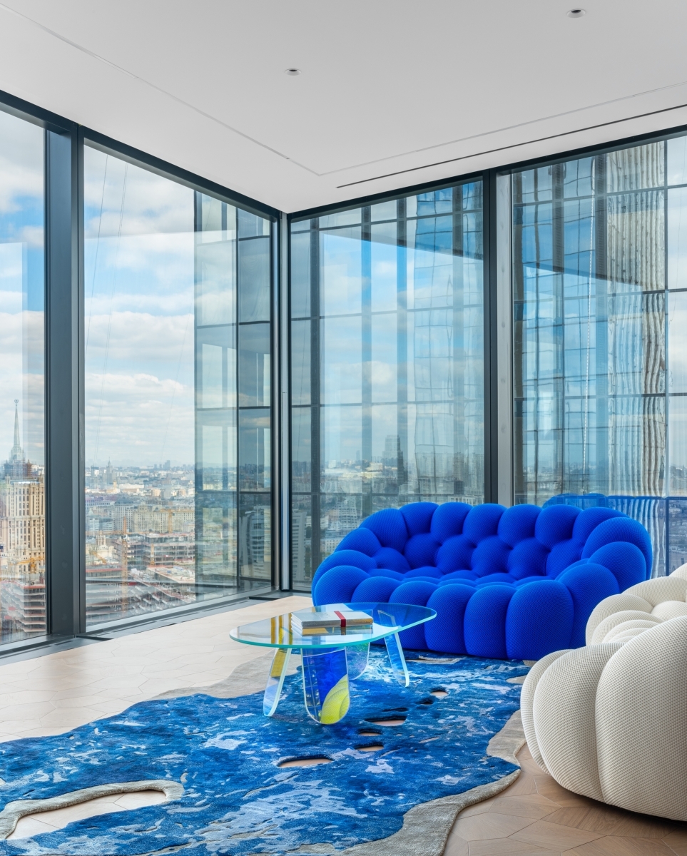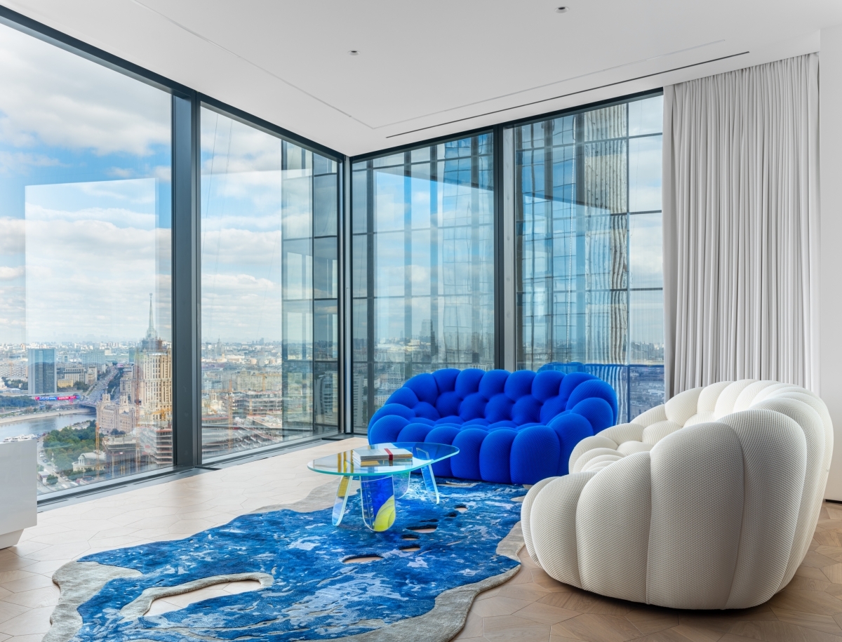 Центральные элементы гостиной — эффектные диваны Roche Bobois из коллекции Bubble. В ансамбль к ним дизайнер подобрала градиентный столик Glas Italia и ковер, выполненный вручную на заказ в компании DOVLET HOUSE. Но главным «героем» пространства является невероятный вид на высотку гостиницы Radisson Royal Hotel Moscow (бывшая «Украина») Центральные элементы гостиной — эффектные диваны Roche Bobois из коллекции Bubble. В ансамбль к ним дизайнер подобрала градиентный столик Glas Italia и ковер, выполненный вручную на заказ в компании DOVLET HOUSE. Но главным «героем» пространства является невероятный вид на высотку гостиницы Radisson Royal Hotel Moscow (бывшая «Украина»)