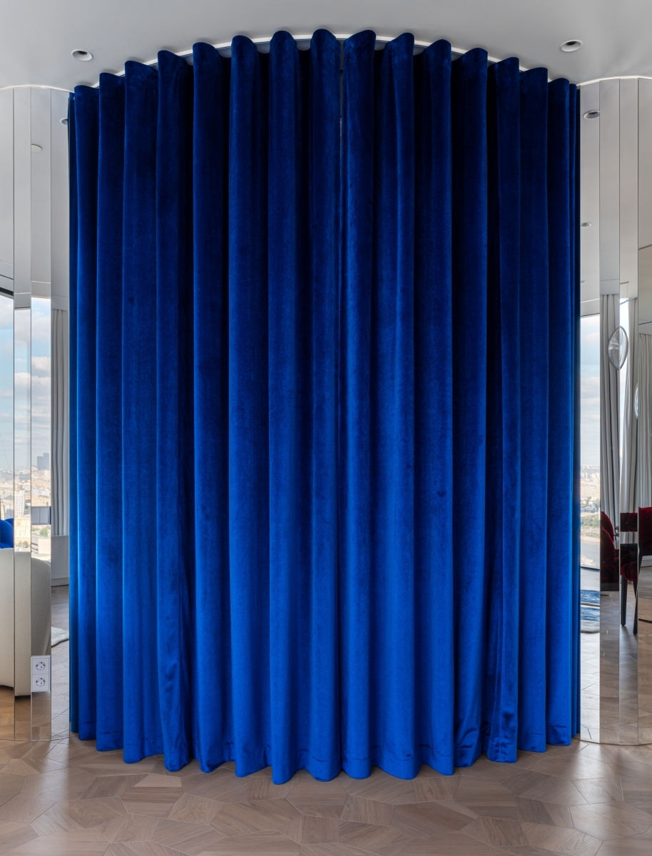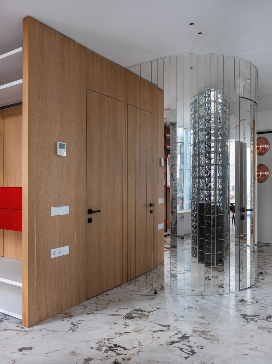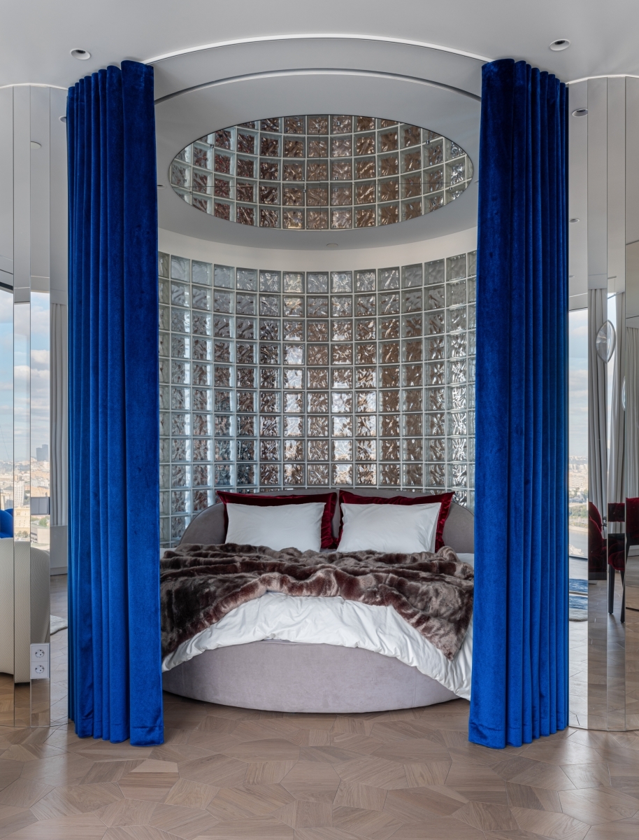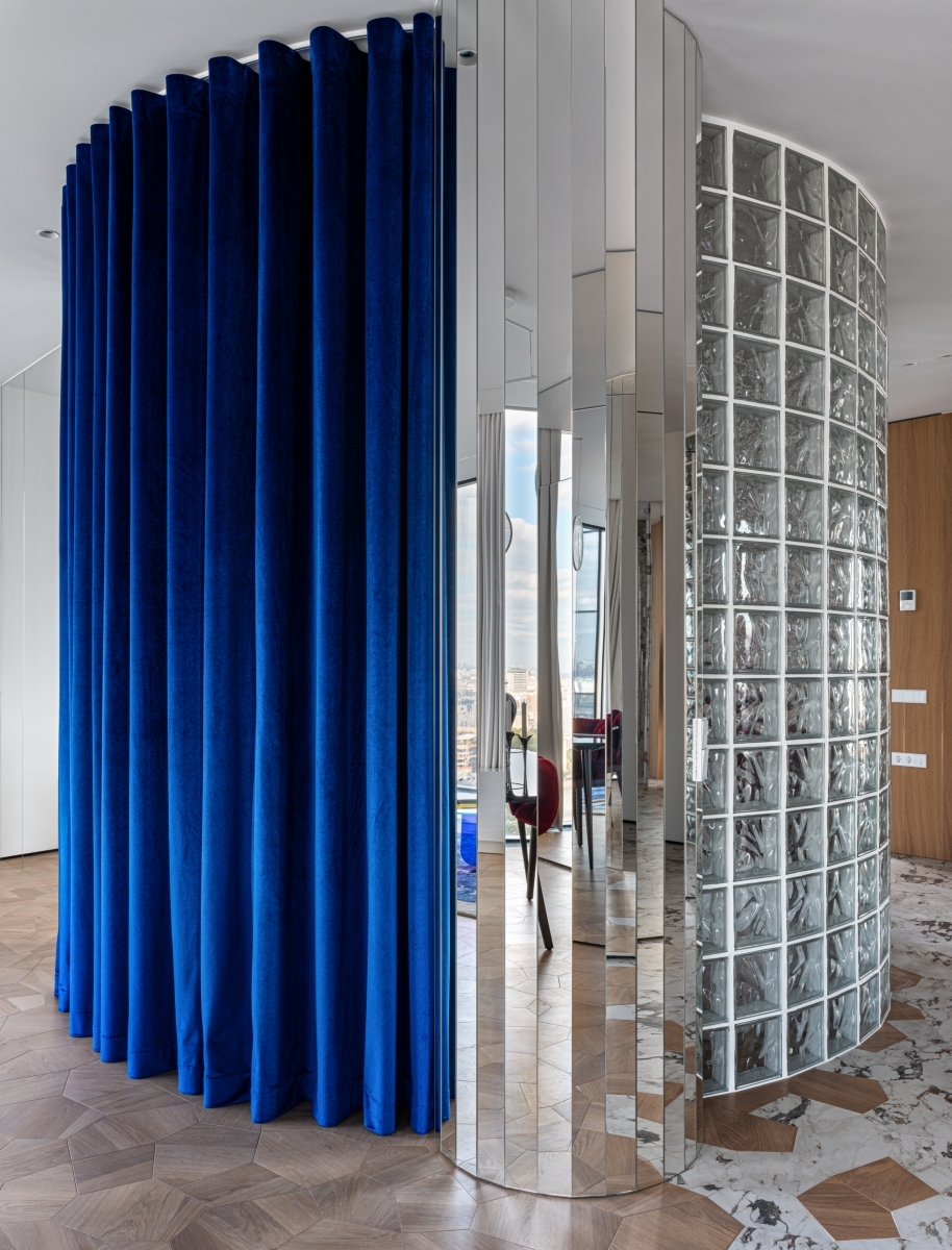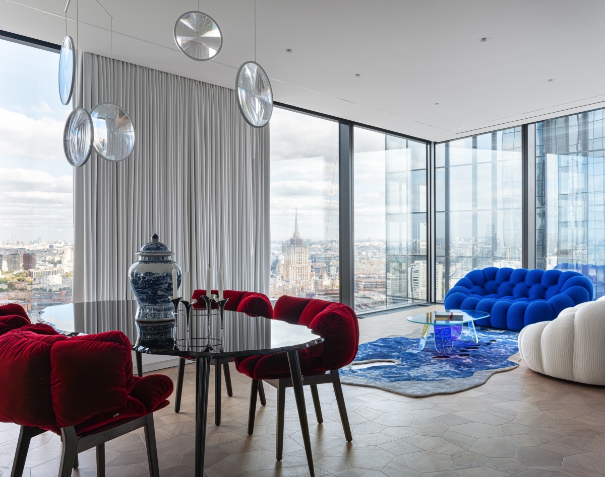 Неожиданное решение кроется уже в планировке. В квартире нет ни единой стены, если не считать радиусную перегородку, обрамляющую кровать. Помещения свободно перетекают одно в другое, без четкого деления на функциональные зоны. В сочетании с окнами в пол, из которых открывается невероятный вид на Москву, этот прием создает ощущение легкости и простора. Глянцевые фасады мебели и зеркальные стеновые панели «впускают» городскую панораму в интерьер, делая ее полноправной частью общего замысла.