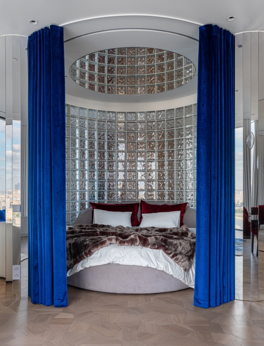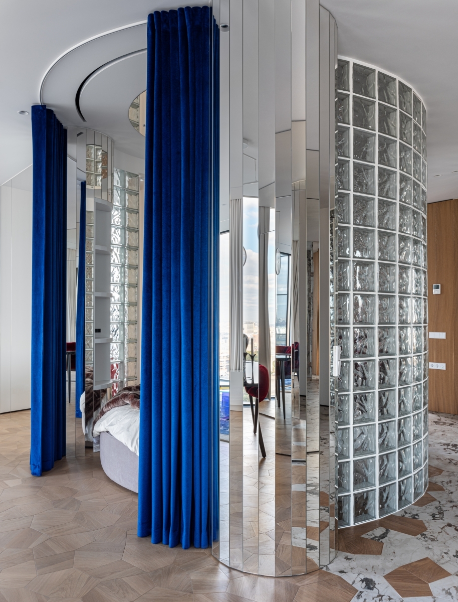 Еще одна особенность оформления — мягкие, скругленные формы мебели. Даже кровать в зоне спальни круглой формы, не говоря уже о коврах, столиках и светильниках. «Воплощать идеи заказчиков, даже самые необычные, для меня сплошное удовольствие, — продолжает Ирина Чернейкина. — Заказчица сразу обозначила, что не любит острые углы, на это мы и ориентировались при подборе мебели и декора. Еще одним пожеланием было добавить отсылки к советскому времени — так в проекте появились модульные полы из паркетной доски, которая плавно перетекает в керамогранит, и перегородка из стеклоблоков». Цветовая гамма выстроена на неожиданных контрастах: электрические синие и красные акценты на белом фоне, словно чистый холст, будоражат воображение, заряжают творческой энергией. По словам дизайнера, вдохновением для палитры послужила фотография пустыни на фоне неба.