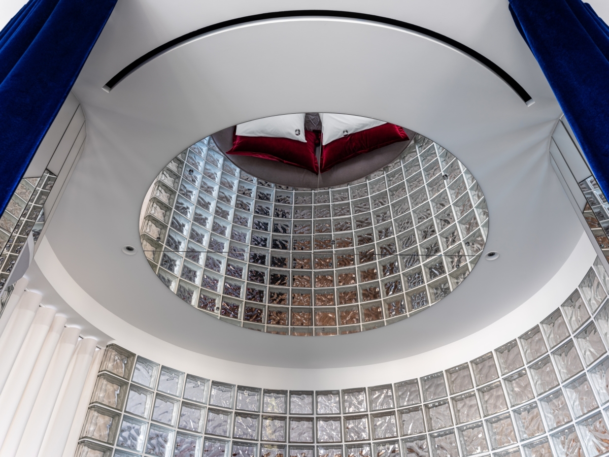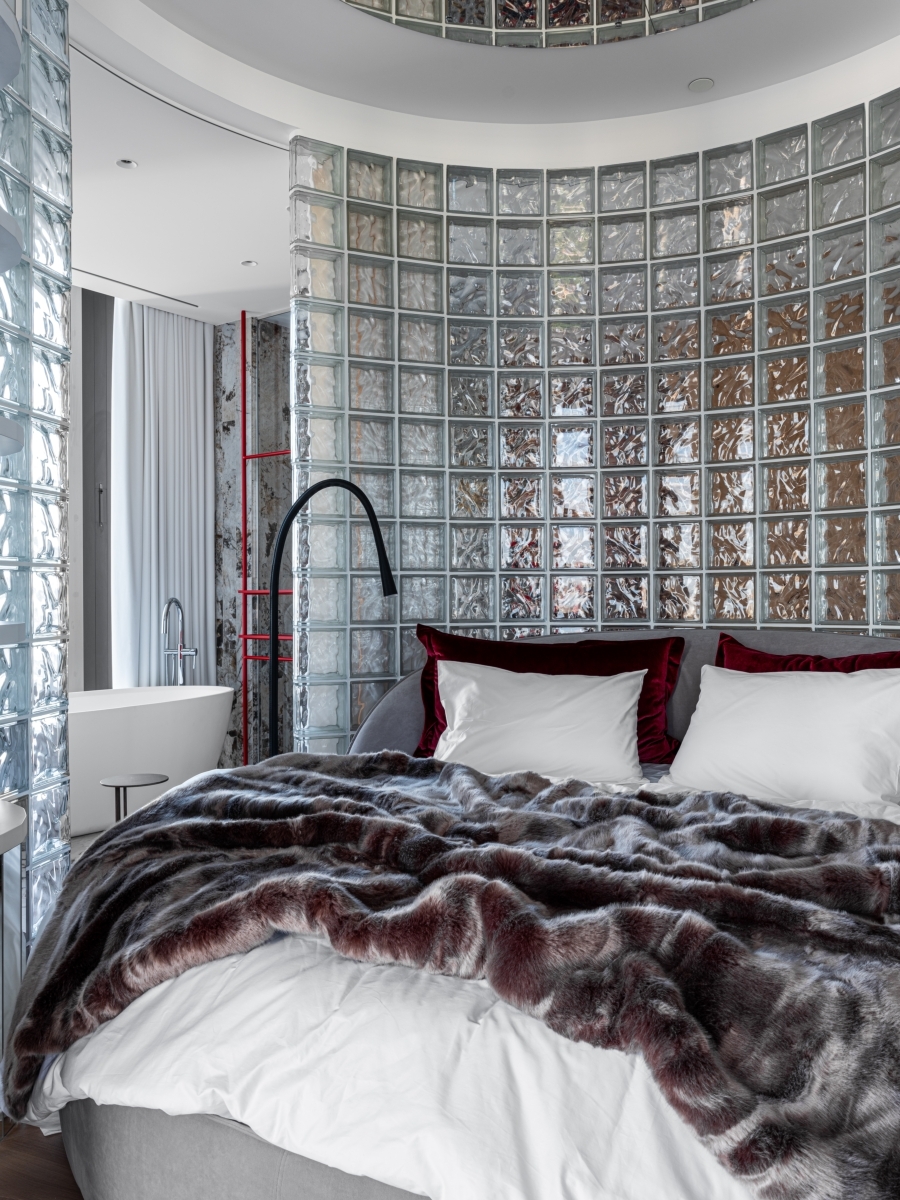 В квартире нет комнат как таковых, пространство имеет свободную планировку без четкого разделения на помещения. Более того, здесь нет ни единой стены, кроме радиусной перегородки из стеклоблоков, которая повторяет по форме круглую кровать