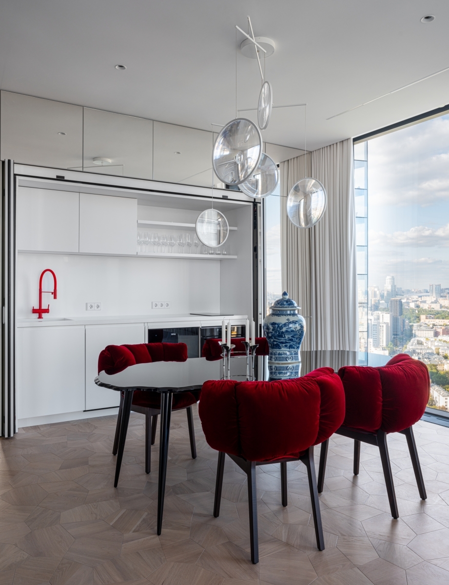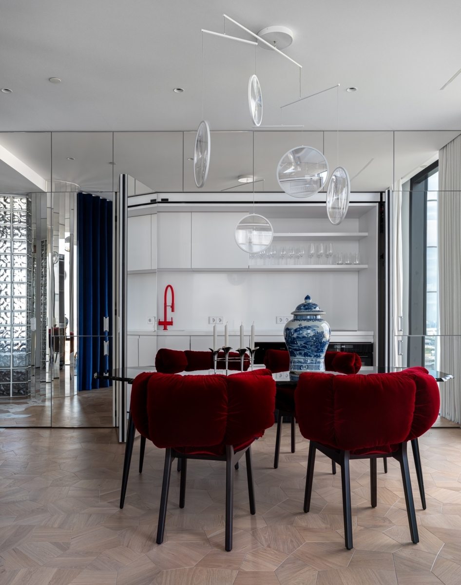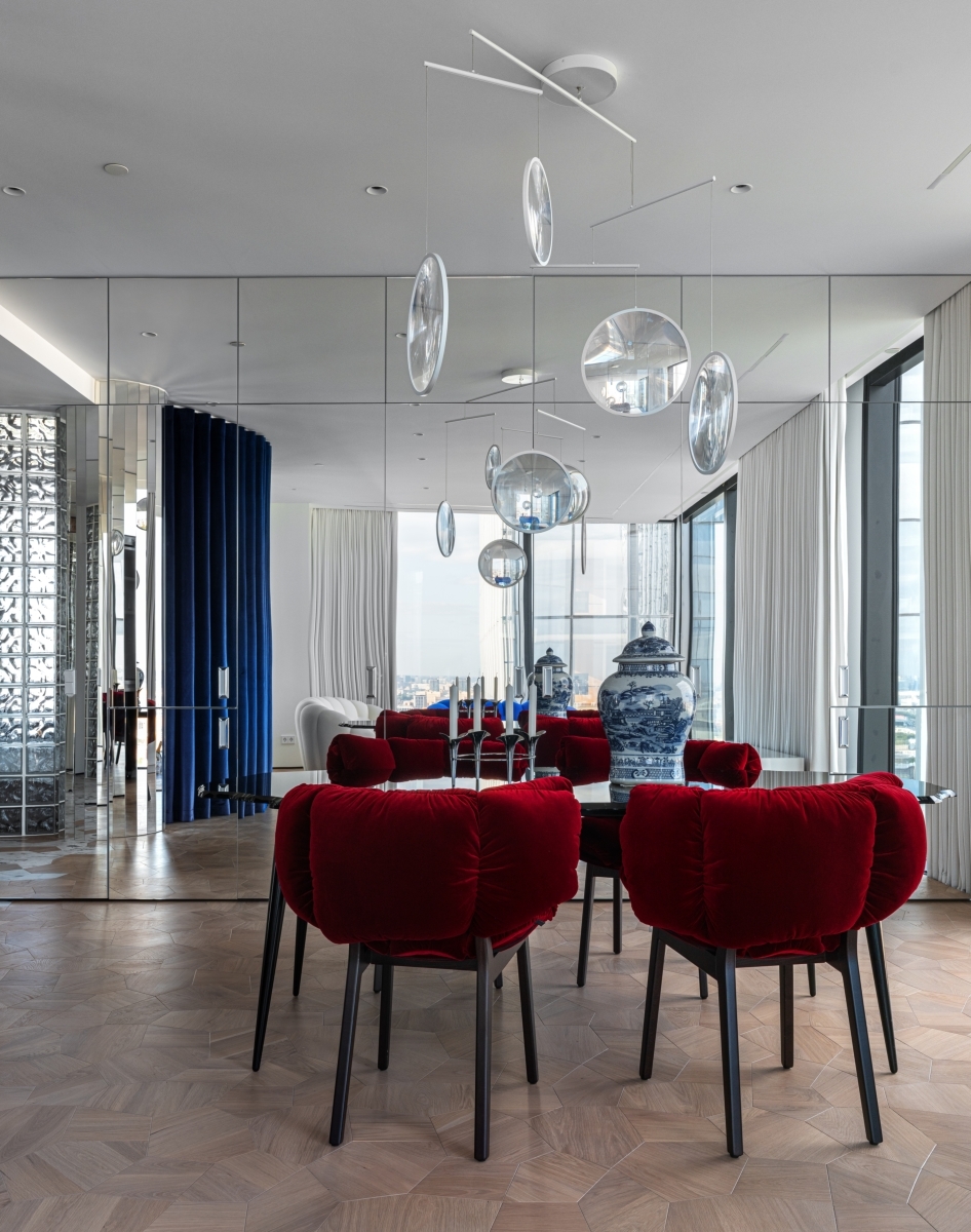 В оформлении — обилие зеркал, они визуально расширяют пространство, добавляя света и отражая головокружительные виды Москвы. Даже кухонный гарнитур спрятан за зеркальными фасадами. Роскошный обеденный стол EDRA украшают подсвечник от Georg Jensen и ваза MacKenzie Childs в китайском стиле. Люстра DCW — игривый оммаж кинетической скульптуре-мобилю из фильма «Служебный роман». Кресла, EDRA. Кухня выполнена на заказ, компанией ARTHUNTER В оформлении — обилие зеркал, они визуально расширяют пространство, добавляя света и отражая головокружительные виды Москвы. Даже кухонный гарнитур спрятан за зеркальными фасадами. Роскошный обеденный стол EDRA украшают подсвечник от Georg Jensen и ваза MacKenzie Childs в китайском стиле. Люстра DCW — игривый оммаж кинетической скульптуре-мобилю из фильма «Служебный роман». Кресла, EDRA. Кухня выполнена на заказ, компанией ARTHUNTER