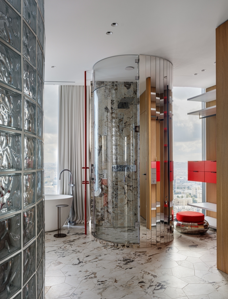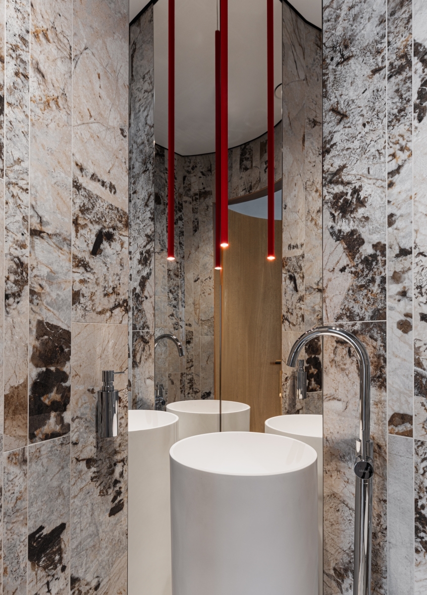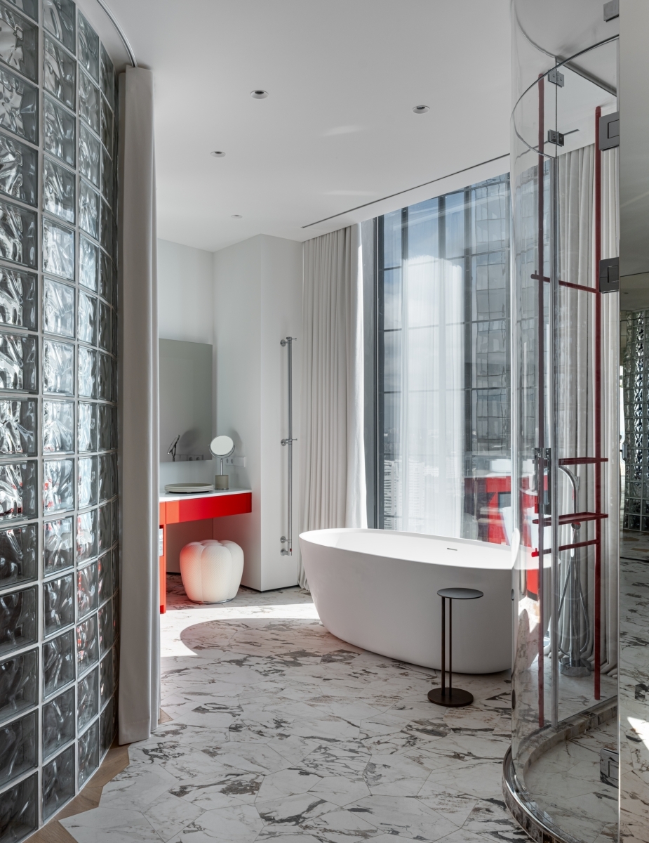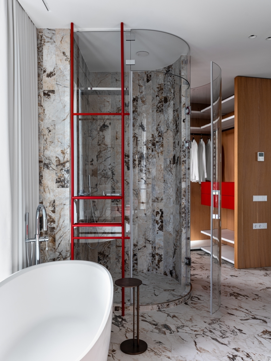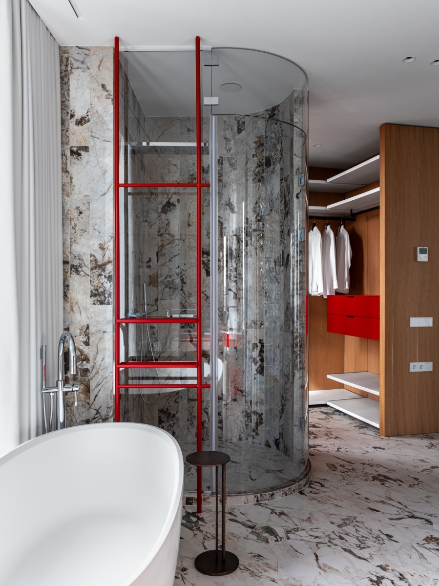 Слева. Зона ванной и гардеробной расположены в открытом пространстве и наполнены яркими красными акцентами. Душевая напоминает космическую капсулу, изготовленную из гнутого стекла Справа. Фрагмент гостевого санузла. Напольная раковина, Vincea. Смеситель, Abber Слева. Зона ванной и гардеробной расположены в открытом пространстве и наполнены яркими красными акцентами. Душевая напоминает космическую капсулу, изготовленную из гнутого стекла Справа. Фрагмент гостевого санузла. Напольная раковина, Vincea. Смеситель, Abber