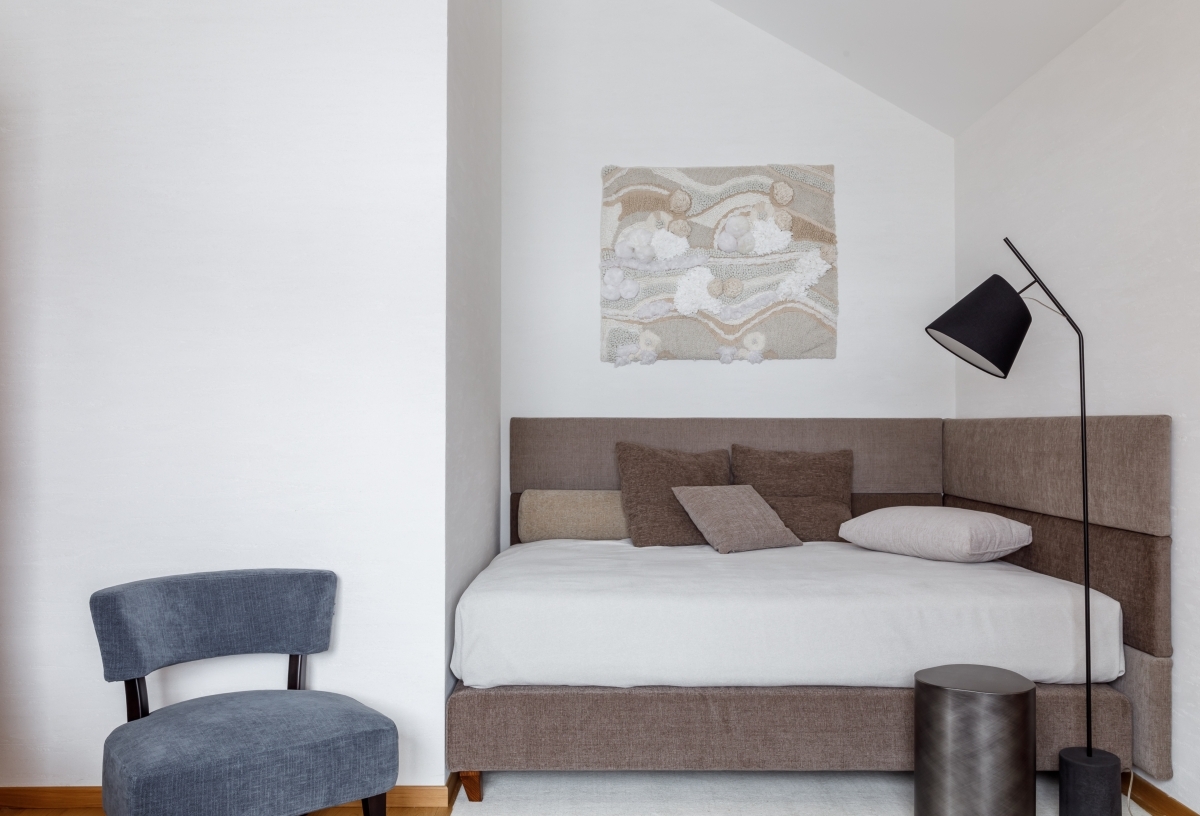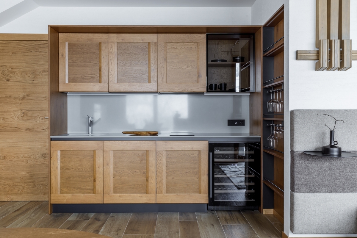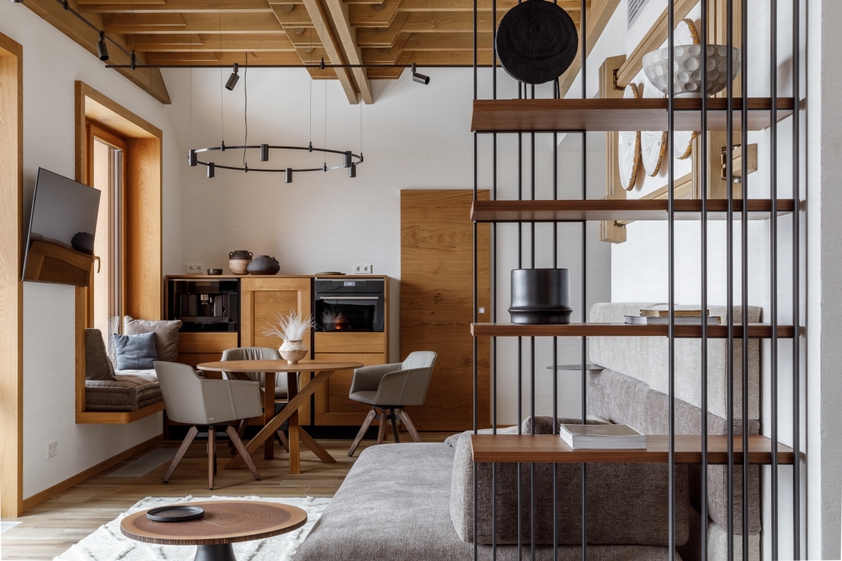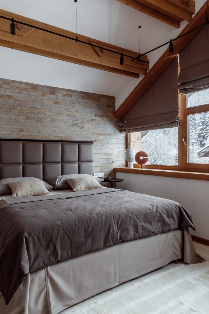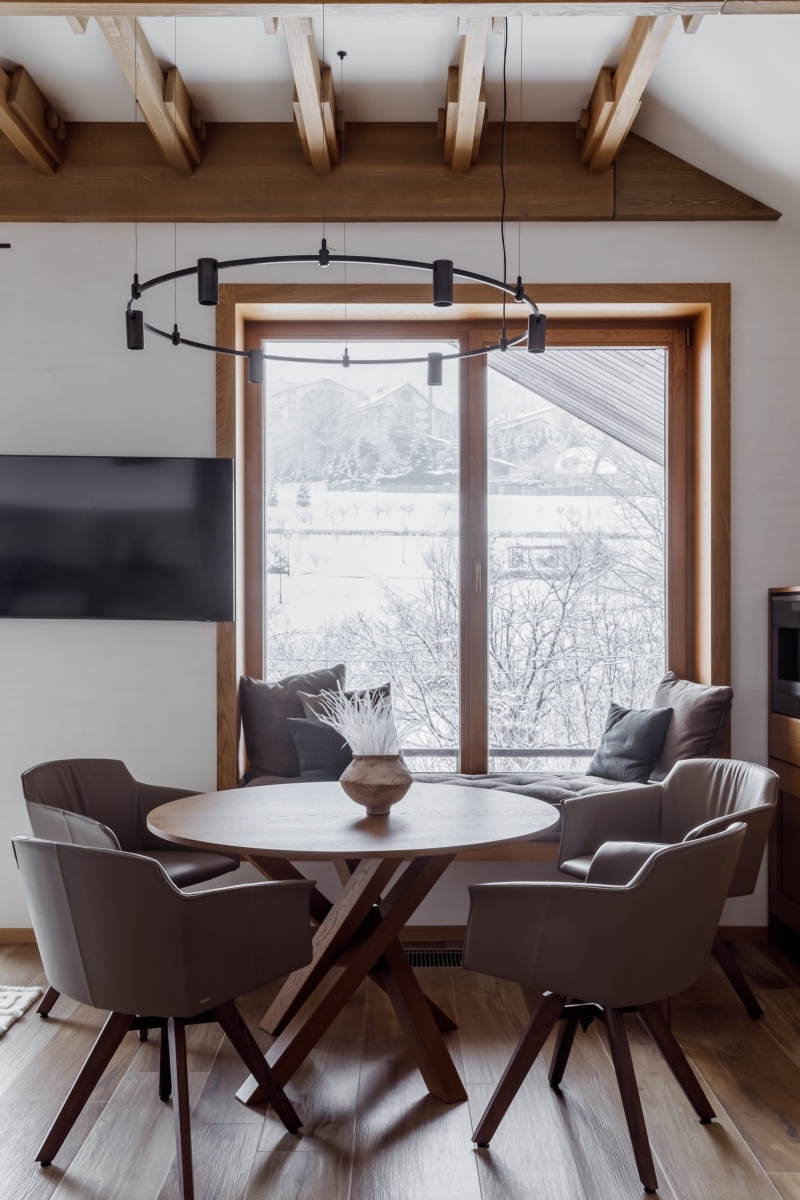 В основе отделки — натуральное дерево (балки из массива, дубовые окна) и дровяной камин Piazzetta. Итальянская мебель и свет придают интерьеру актуальность и сдержанную респектабельность. Теплая природная палитра, дополненная светлыми и дымчатыми оттенками, подчеркивает высоту потолков и усиливает связь с ландшафтом. Центром притяжения стала кухня Veneta Cucine из натурального шпона с кварцевой столешницей, интегрированной мойкой и продуманной эргономикой. Техника Electrolux, вытяжка Falmec и винный шкаф формируют идеальную зону для гастрономических ритуалов. Образ жизни продолжается и на террасе: летняя кухня из нержавеющей стали и мебель Emu позволяют завтракать с видом на вершины и ужинать под звездами.