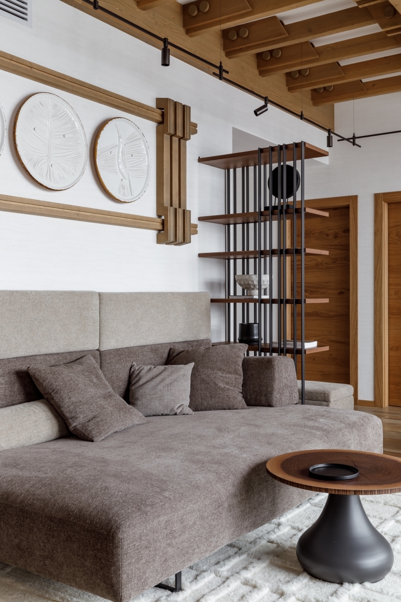 Фрагмент гостиной. Паркет, Berti. Диван, Twils. Стеллаж, журнальный столик, Cattelan Italia. Декор, художник-керамист Катерина Грань.
