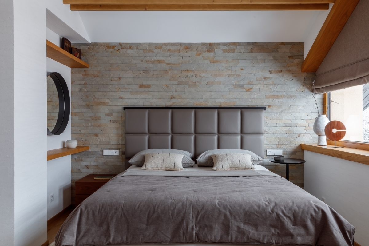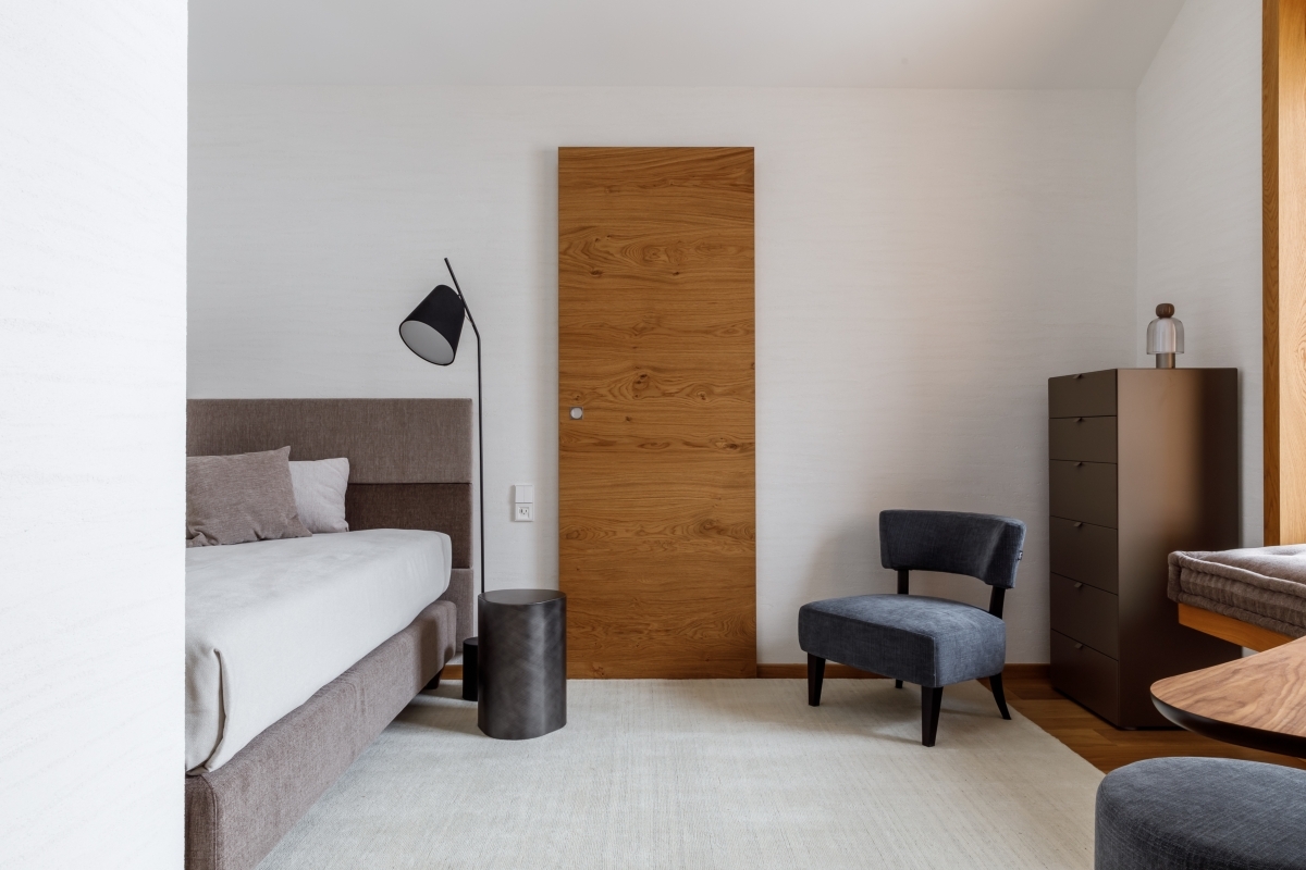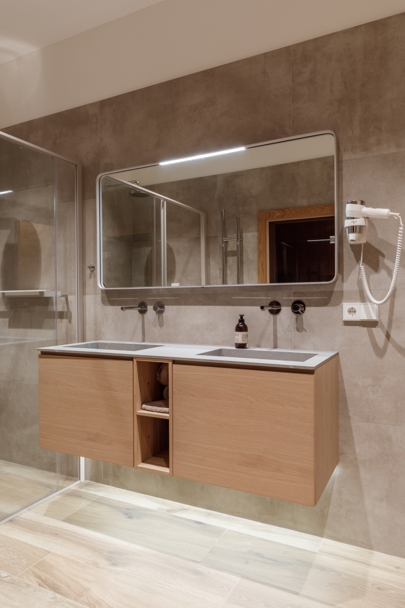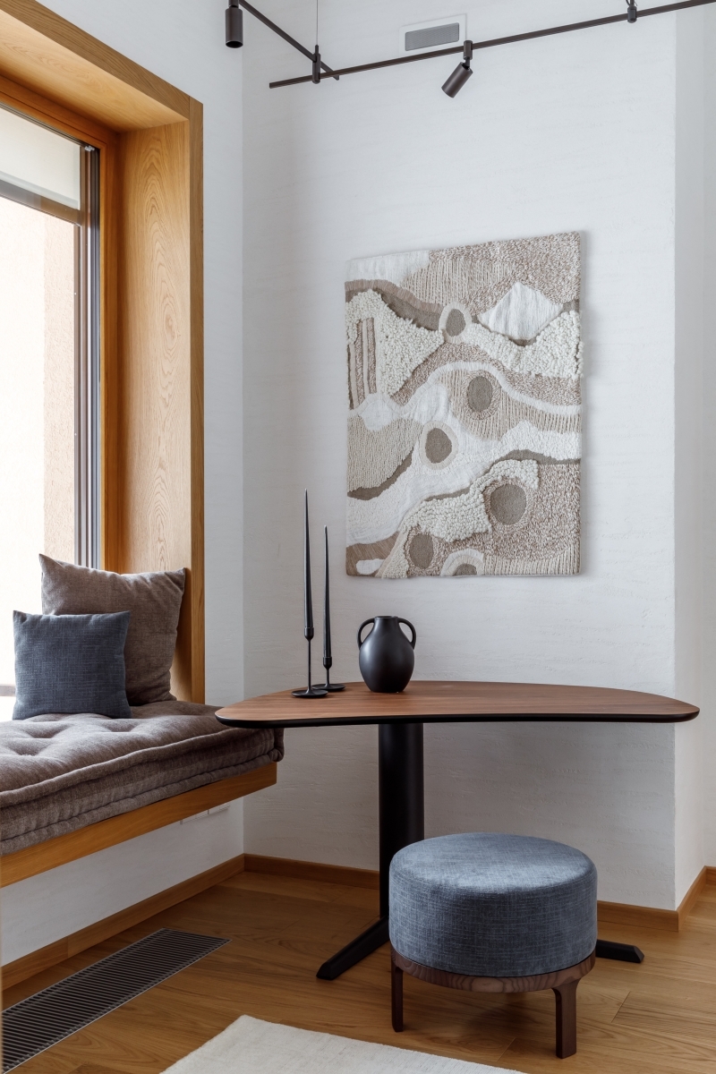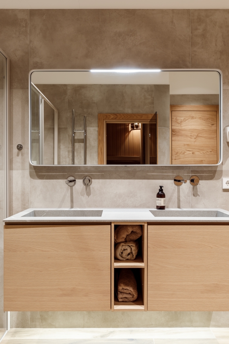 «Квартира требовала полного преображения, однако обладала выдающимся потенциалом — высокие потолки, панорамные окна с видом на горы. Именно эти параметры определили планировочную концепцию. Просторная кухня-гостиная с камином и выходом на террасу стала сердцем дома, а в приватной зоне разместились детская комната, главная спальня, ванная комната, баня и отдельные гардеробные, включая для спортивной экипировки», — комментирует решение Екатерина Белова.