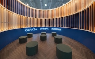 «Изнанка» лестницы - поверхность двоякой кривизны, ее обшивали плоским шпоном японского клена - сикоморы. Эта ювелирная работа потребовала огромного мастерства. Тонкие пластины шпона вырезали и приклеивали, причем форму выкройки меняли каждые 10-12 см. Сикомора красиво бликует и переливается: поверхность кажется затянутой шелком, а пластичная форма позволяет шпону работать на 100%»