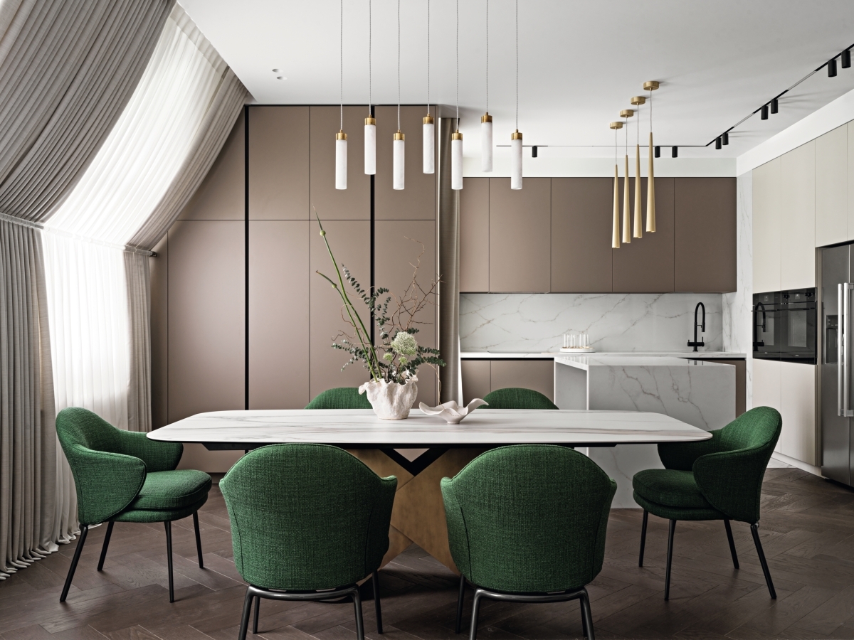 Кухня-столовая — часть открытого пространства общей зоны, оформленного в духе сдержанной роскоши. Тему природы поддерживают обеденные кресла в обивке травяного оттенка, дерево в отделке пола, аксессуары из керамики. Кухня Poliform (салон «Кухонные Интерьеры»). Обеденный стол, Cattelan Italia. Стулья, Minotti. Над столом — подвесные светильники Possoni Tube (компания Emprioum). Инженерная доска, Finex. Кухня-столовая — часть открытого пространства общей зоны, оформленного в духе сдержанной роскоши. Тему природы поддерживают обеденные кресла в обивке травяного оттенка, дерево в отделке пола, аксессуары из керамики. Кухня Poliform (салон «Кухонные Интерьеры»). Обеденный стол, Cattelan Italia. Стулья, Minotti. Над столом — подвесные светильники Possoni Tube (компания Emprioum). Инженерная доска, Finex.