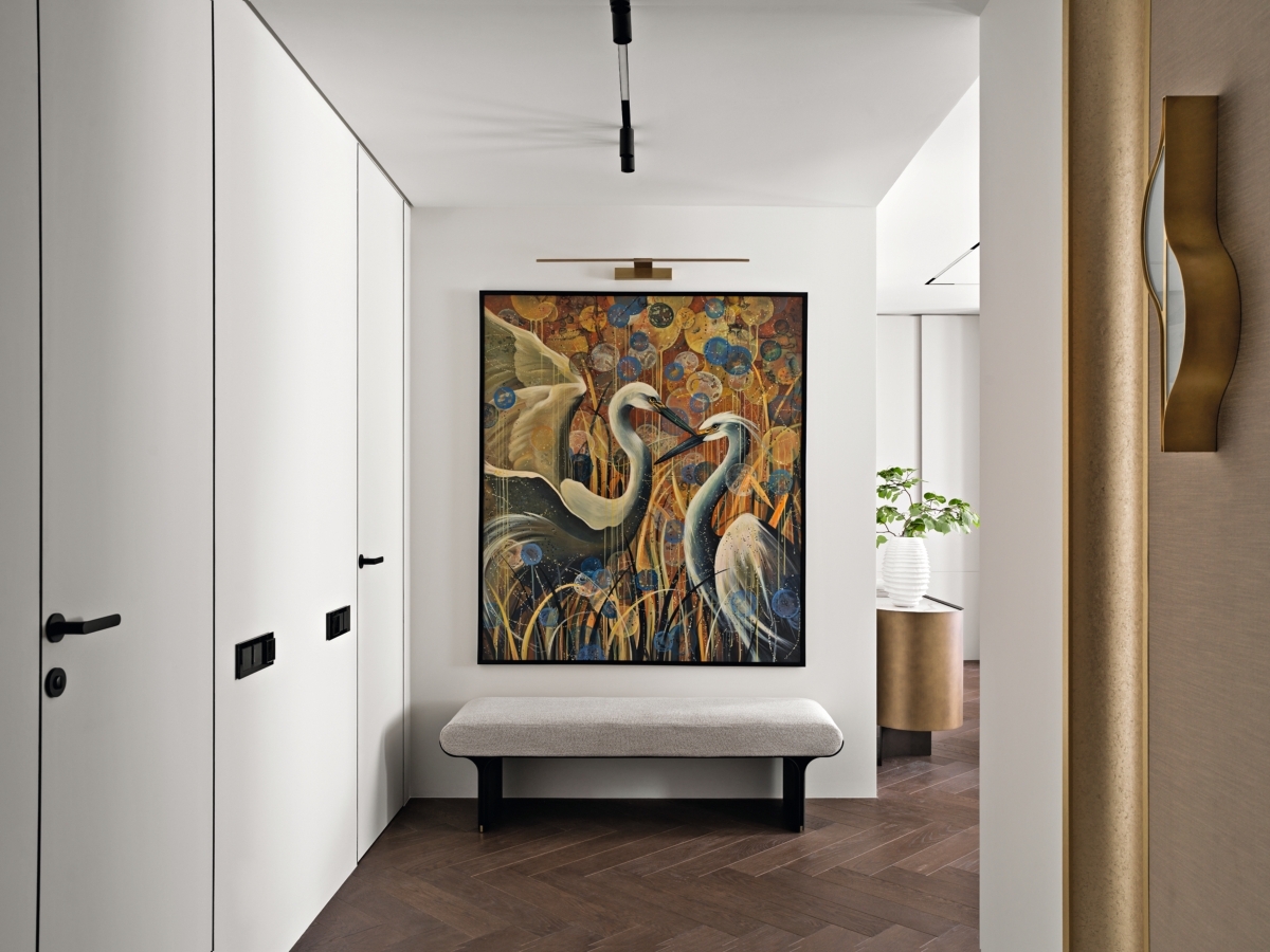 Фрагмент прихожей. В проеме справа — гостиная. За дверью слева — гардеробная. Картина с изображением цапель символизирует семейное счастье. Картина написана на заказ, Chillartgroup. Гардеробная, Poliform. Банкетка, Galotti&Radice. Стеновые декоративные полосы из латуни, Latuning. Розетки и выключатели, Werkel. Фрагмент прихожей. В проеме справа — гостиная. За дверью слева — гардеробная. Картина с изображением цапель символизирует семейное счастье. Картина написана на заказ, Chillartgroup. Гардеробная, Poliform. Банкетка, Galotti&Radice. Стеновые декоративные полосы из латуни, Latuning. Розетки и выключатели, Werkel.