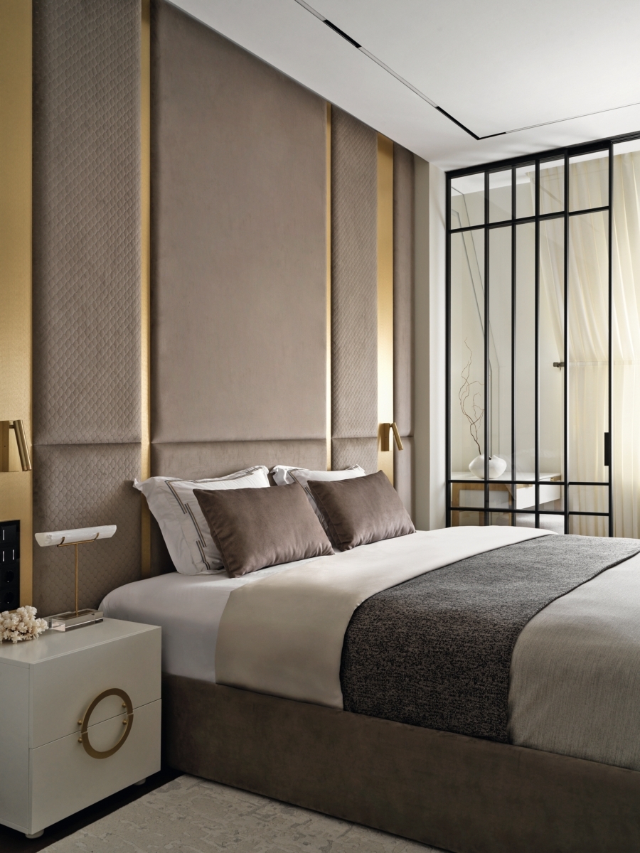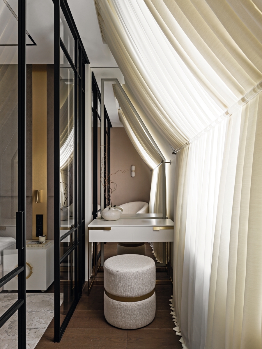«В главной спальне мы использовали мягкие стеновые панели в сочетании с латунными вставками, — рассказывает Анна Гынжу. — Комната разделена раздвижной стеклянной перегородкой, изготовленной по нашим эскизам компанией Standartexpo». Кровать и мягкая стеновая панель, So soft Анны Шункиной. Стеновые декоративные полосы латуни, Latuning. Прикроватные тумбы, Be Home Buro. Бра для чтения, Forstlight. Декор и текстиль, Togas. Ломаная геометрия мансардных окон в спальне владельцев нивелирована воздушными драпировками в цвет стен. Кресло и пуф выполнены на заказ компанией Cazarina. Туалетный столик, Be Home Buro. Бра, Kelly Wearstler. «В главной спальне мы использовали мягкие стеновые панели в сочетании с латунными вставками, — рассказывает Анна Гынжу. — Комната разделена раздвижной стеклянной перегородкой, изготовленной по нашим эскизам компанией Standartexpo». Кровать и мягкая стеновая панель, So soft Анны Шункиной. Стеновые декоративные полосы латуни, Latuning. Прикроватные тумбы, Be Home Buro. Бра для чтения, Forstlight. Декор и текстиль, Togas. Ломаная геометрия мансардных окон в спальне владельцев нивелирована воздушными драпировками в цвет стен. Кресло и пуф выполнены на заказ компанией Cazarina. Туалетный столик, Be Home Buro. Бра, Kelly Wearstler.